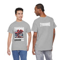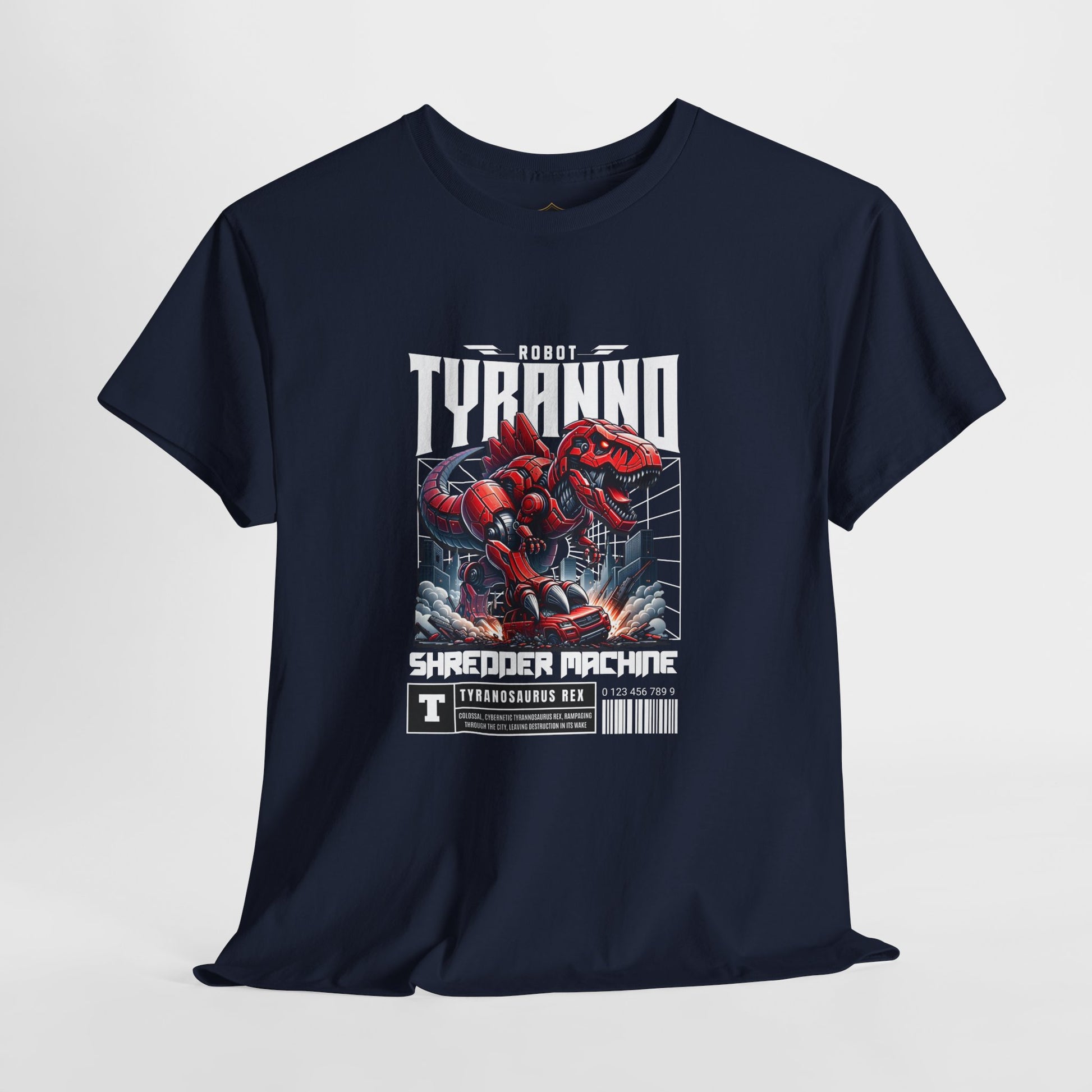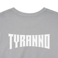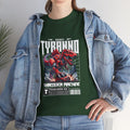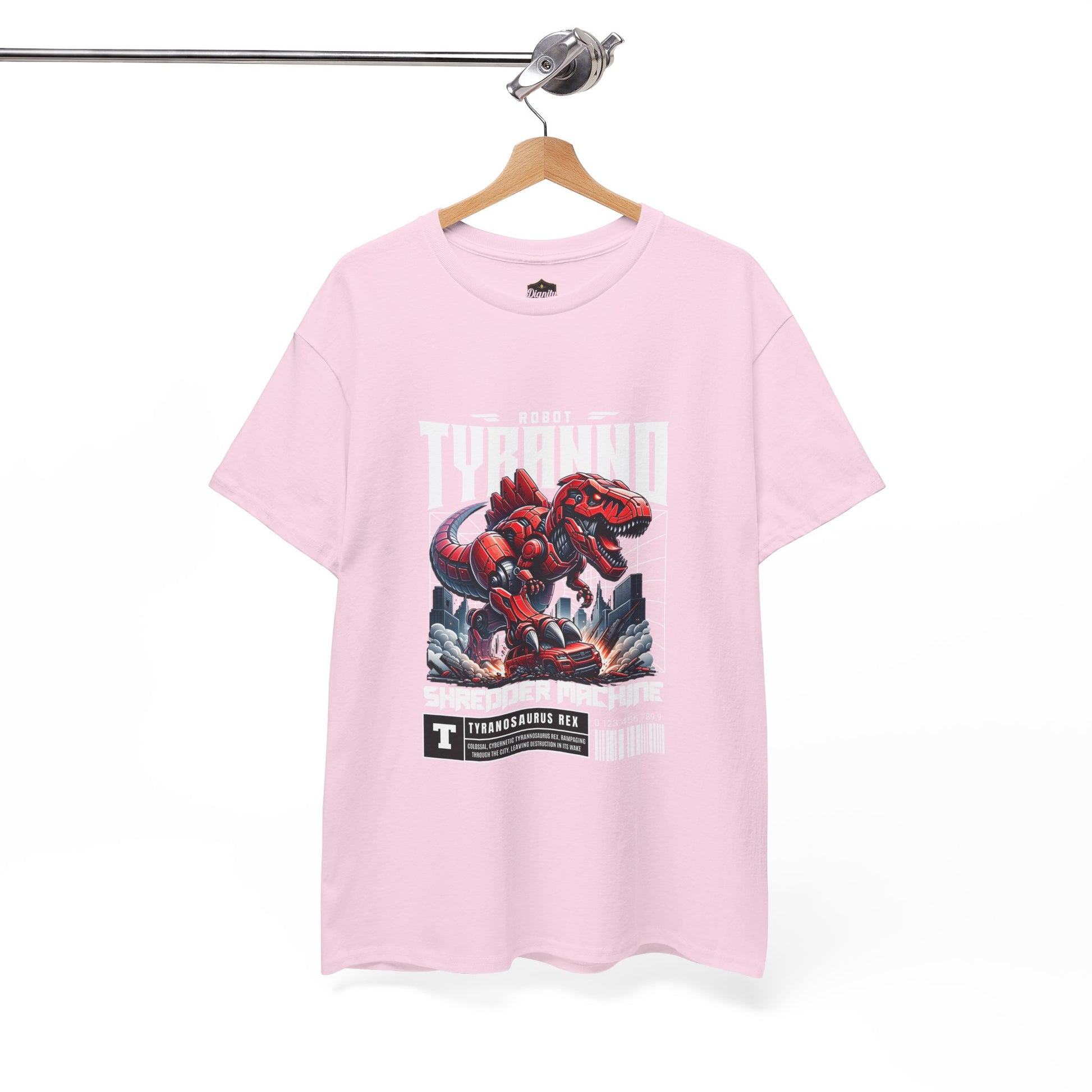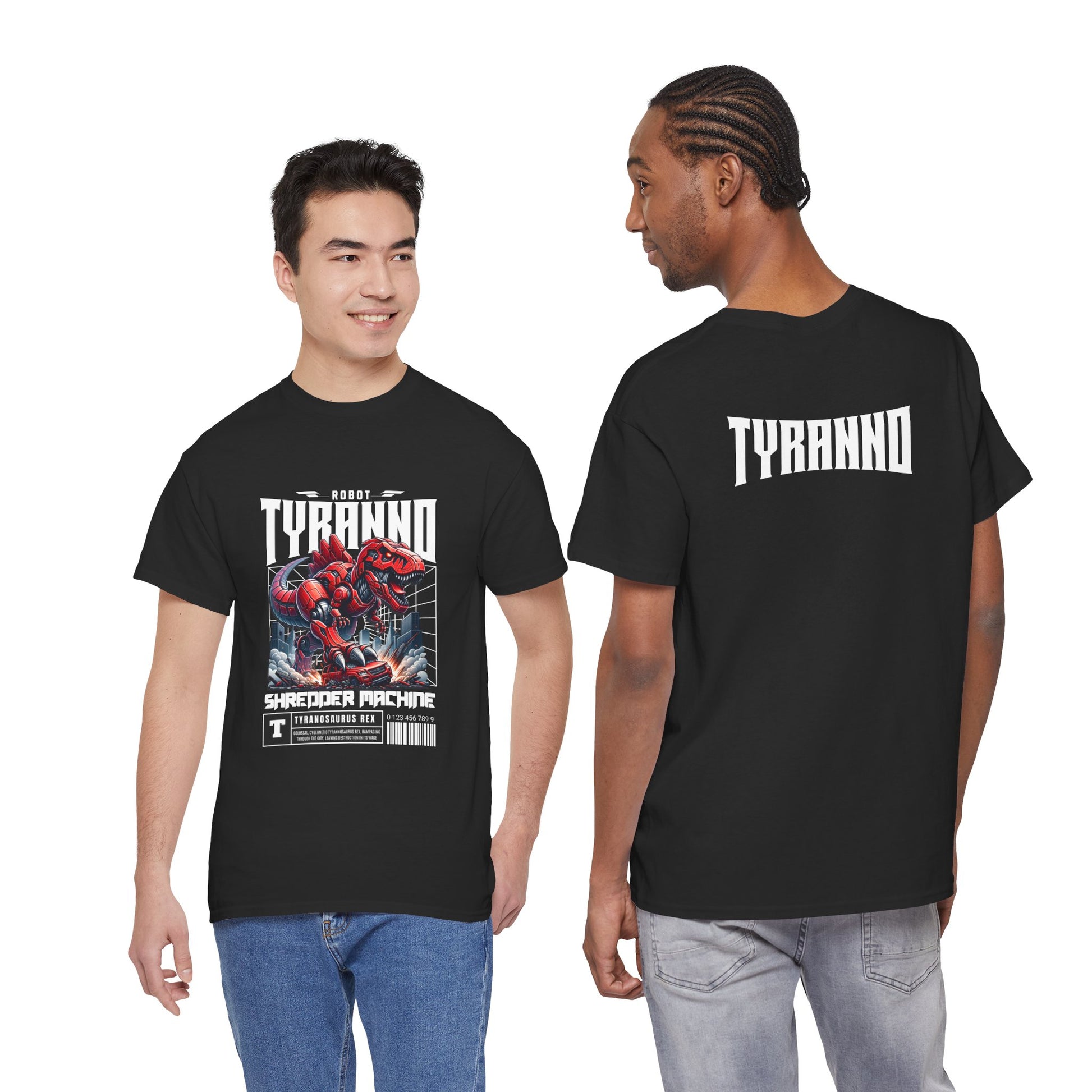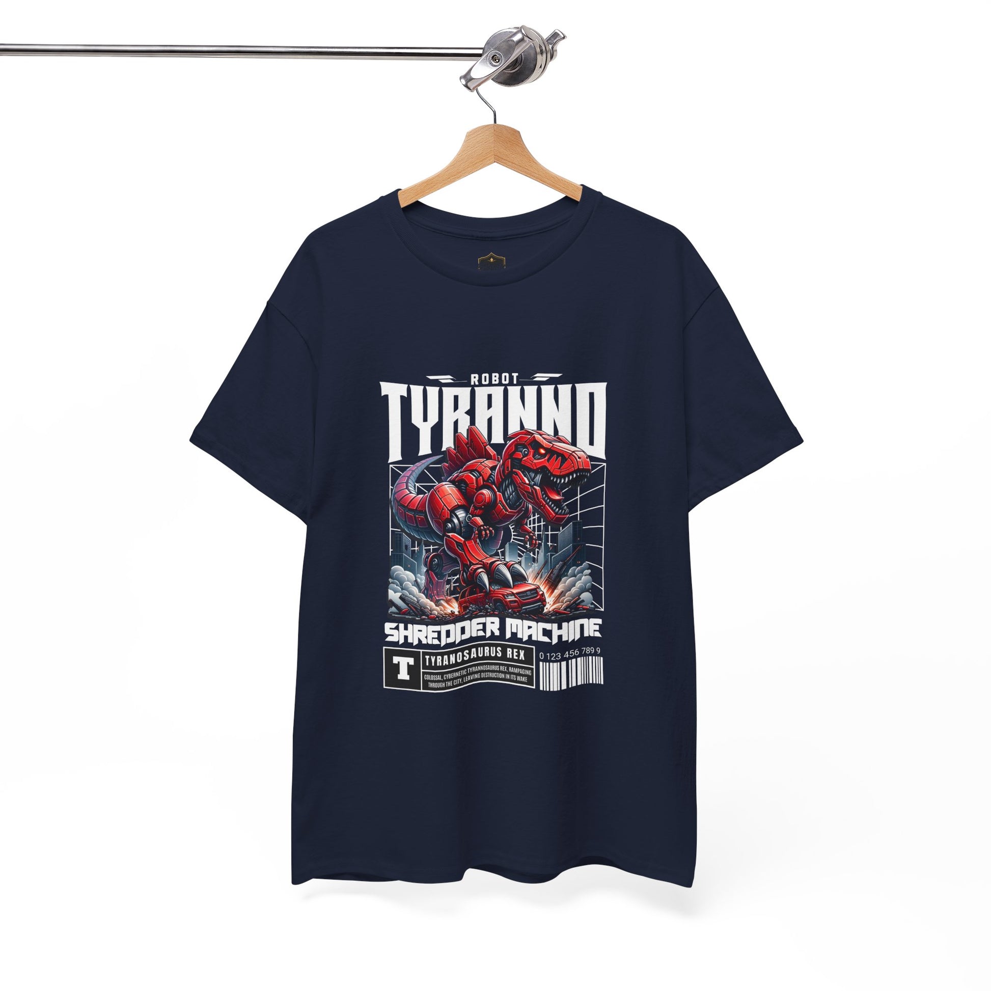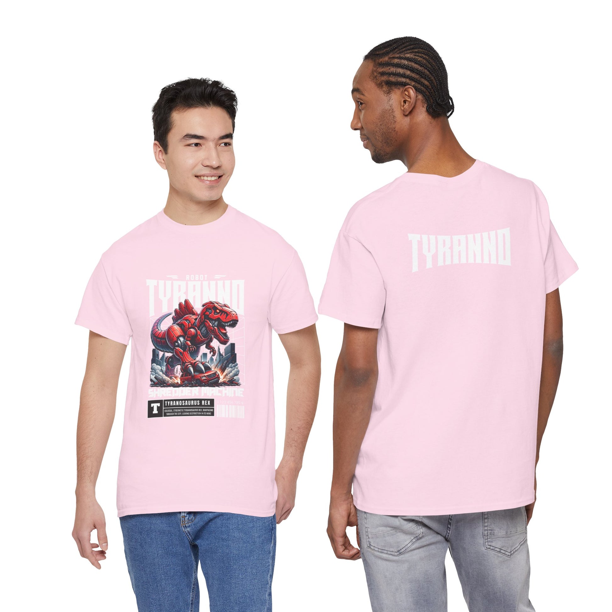This heavyweight cotton tee brings loud, in-your-face energy to a casual wardrobe. A bold, illustrated centerpiece on the chest shows a chrome-clad Tyranno shredding through metal and sparks — retro arcade and metal-poster vibes collide. Clean, arched lettering on the upper back balances the front art so the shirt reads like a vintage concert or game-card collectible. The thicker 180 g/m² fabric and classic crew cut give it structure and a laid-back silhouette that wears well layered under a flannel or alone with distressed denim. Wear it to shows, game nights, or whenever you want apparel that feels like an anthem: gritty, graphic, and unapologetically loud.