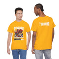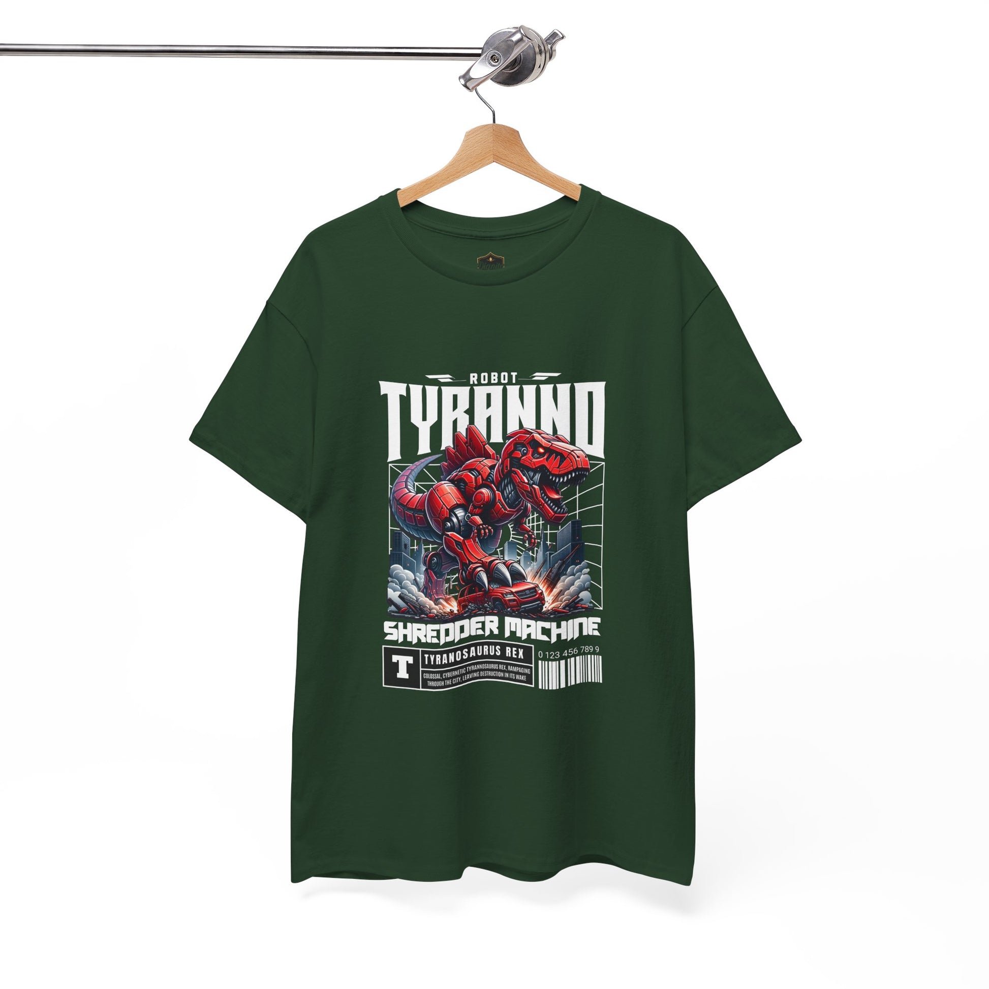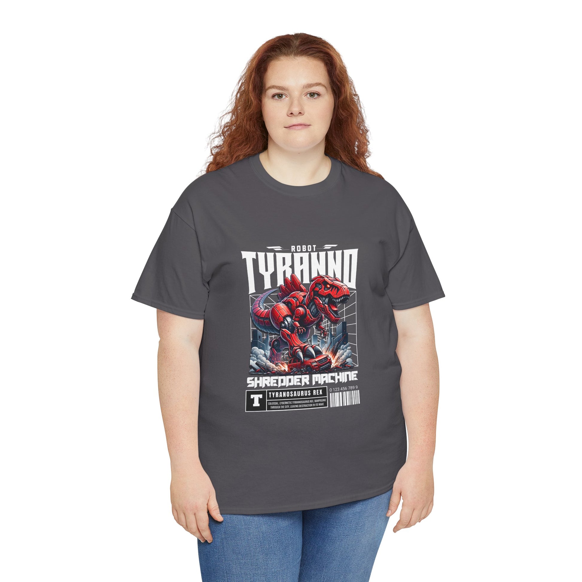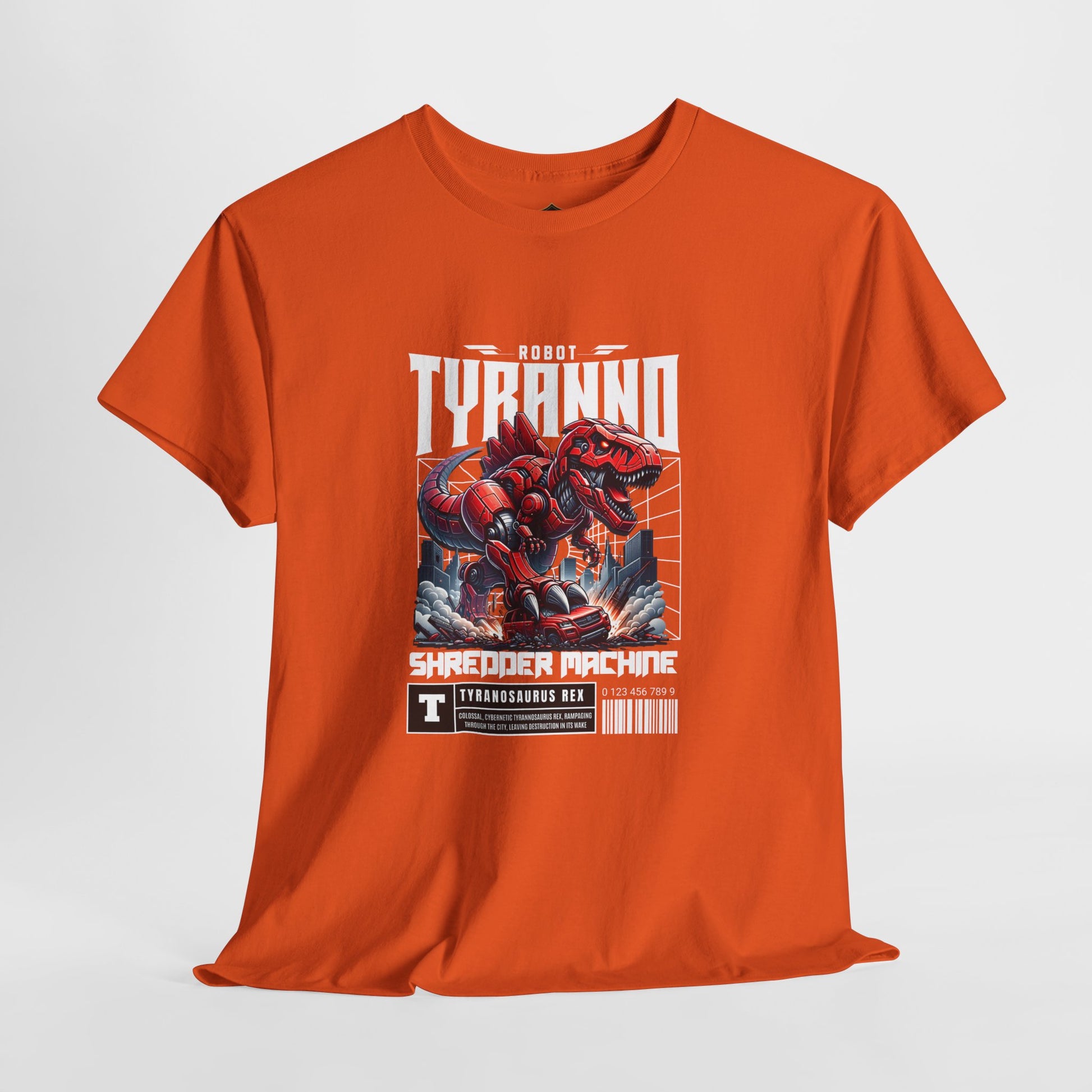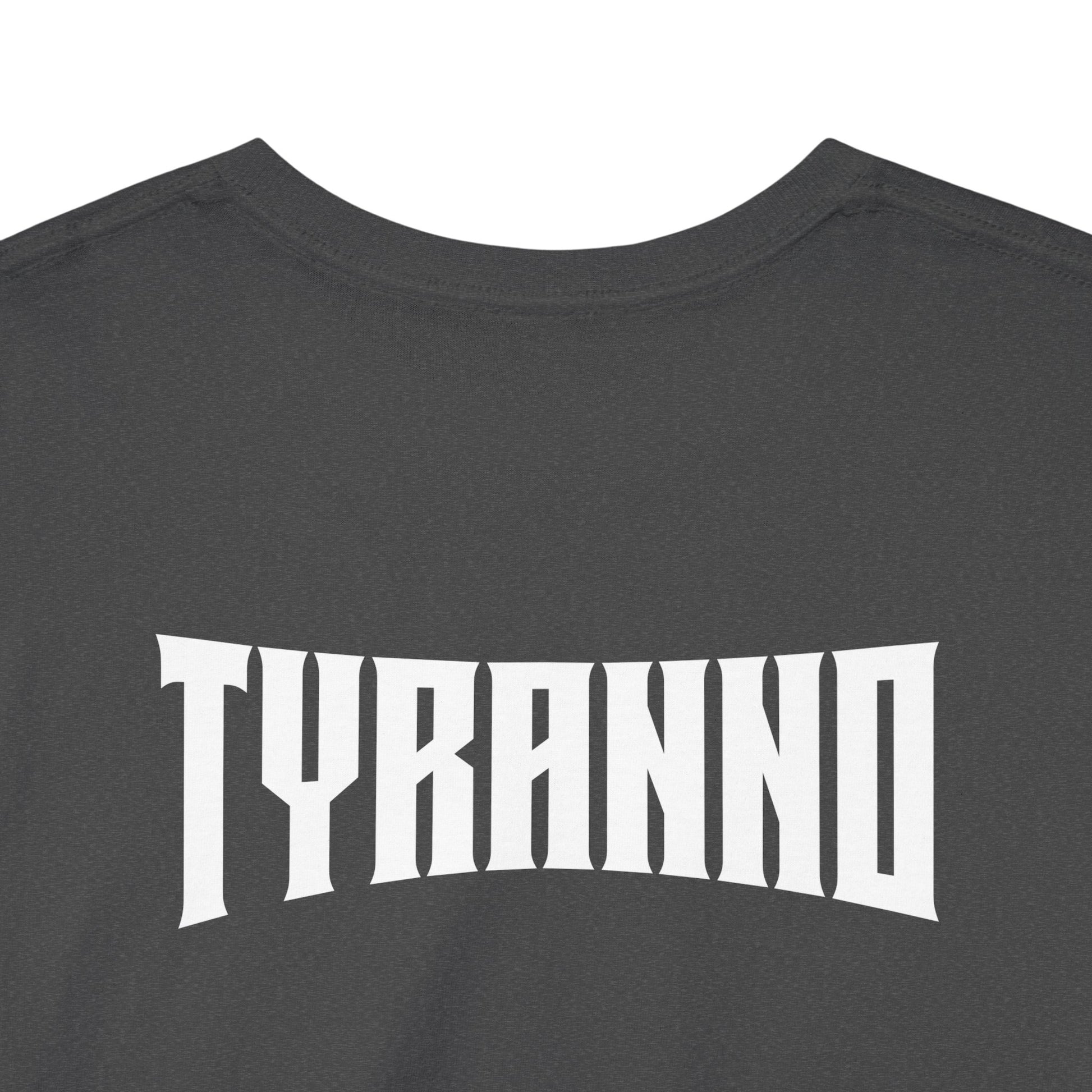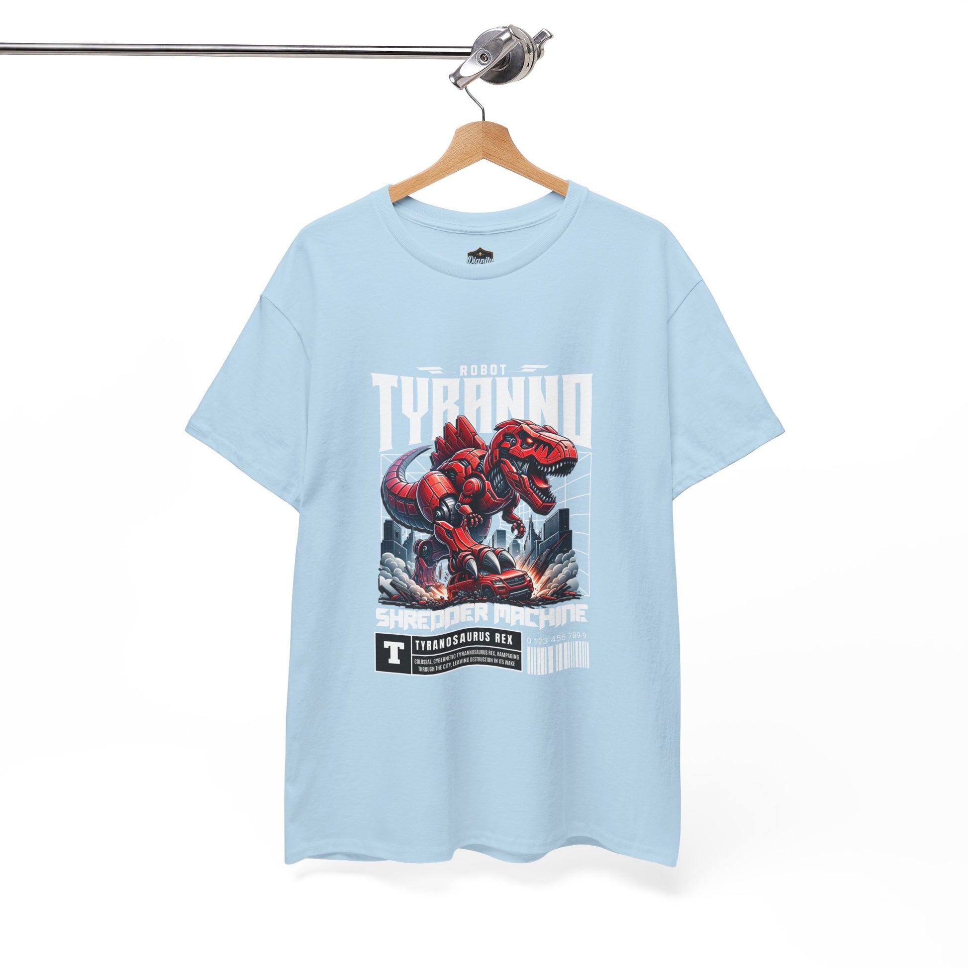 This heavyweight cotton tee brings loud, in-your-face energy to a casual wardrobe. A bold, illustrated centerpiece on the chest shows a chrome-clad Tyranno shredding through metal and sparks — retro arcade and metal-poster vibes collide. Clean, arched lettering on the upper back balances the front art so the shirt reads like a vintage concert or game-card collectible. The thicker 180 g/m² fabric and classic crew cut give it structure and a laid-back silhouette that wears well layered under a flannel or alone with distressed denim. Wear it to shows, game nights, or whenever you want apparel that feels like an anthem: gritty, graphic, and unapologetically loud.