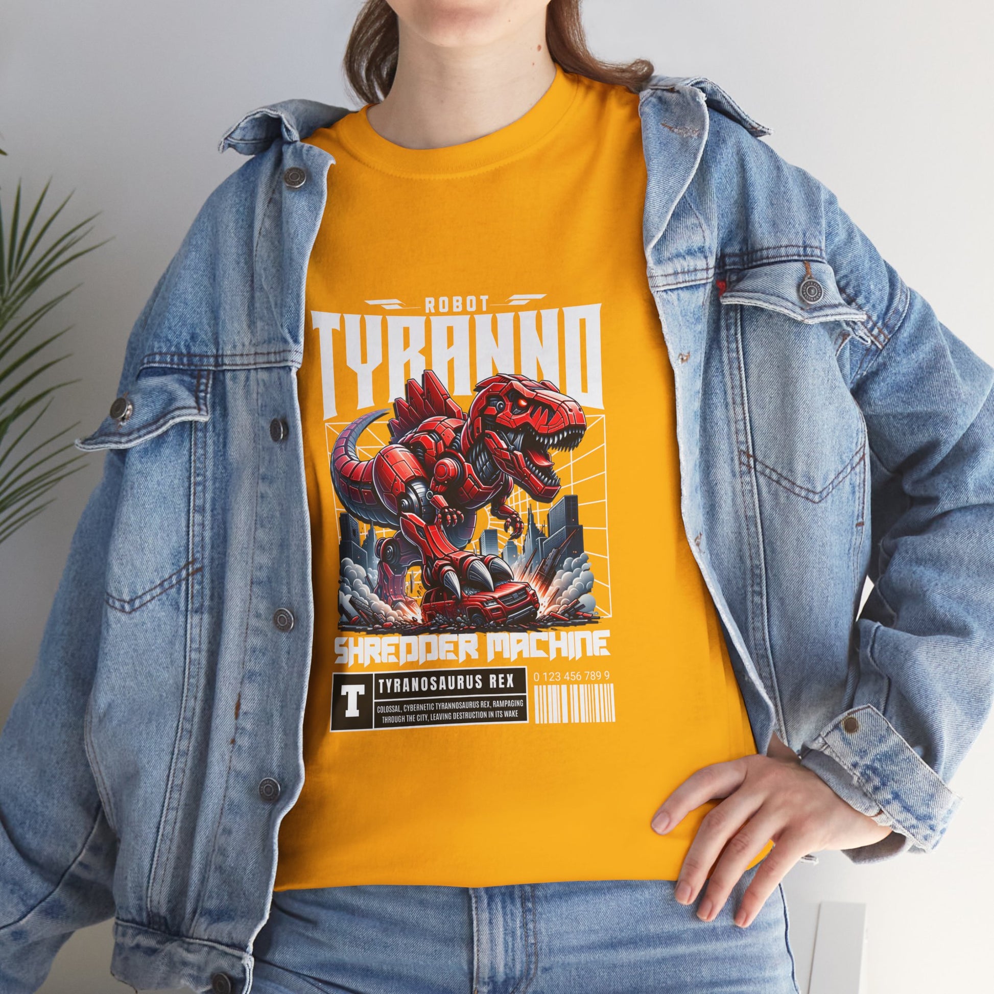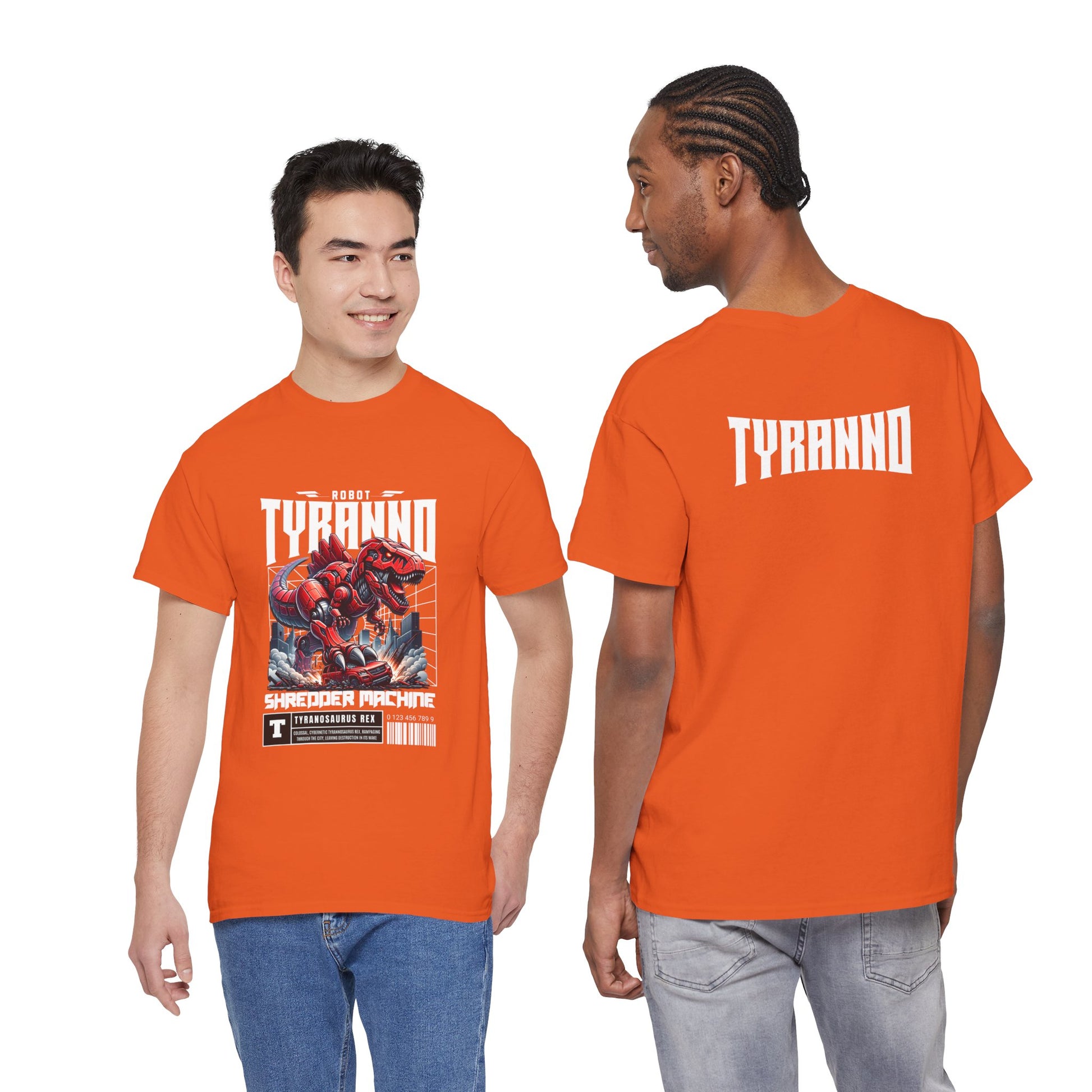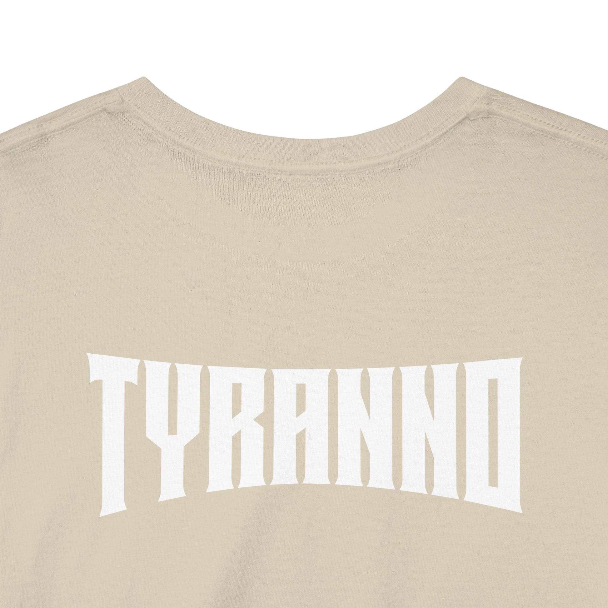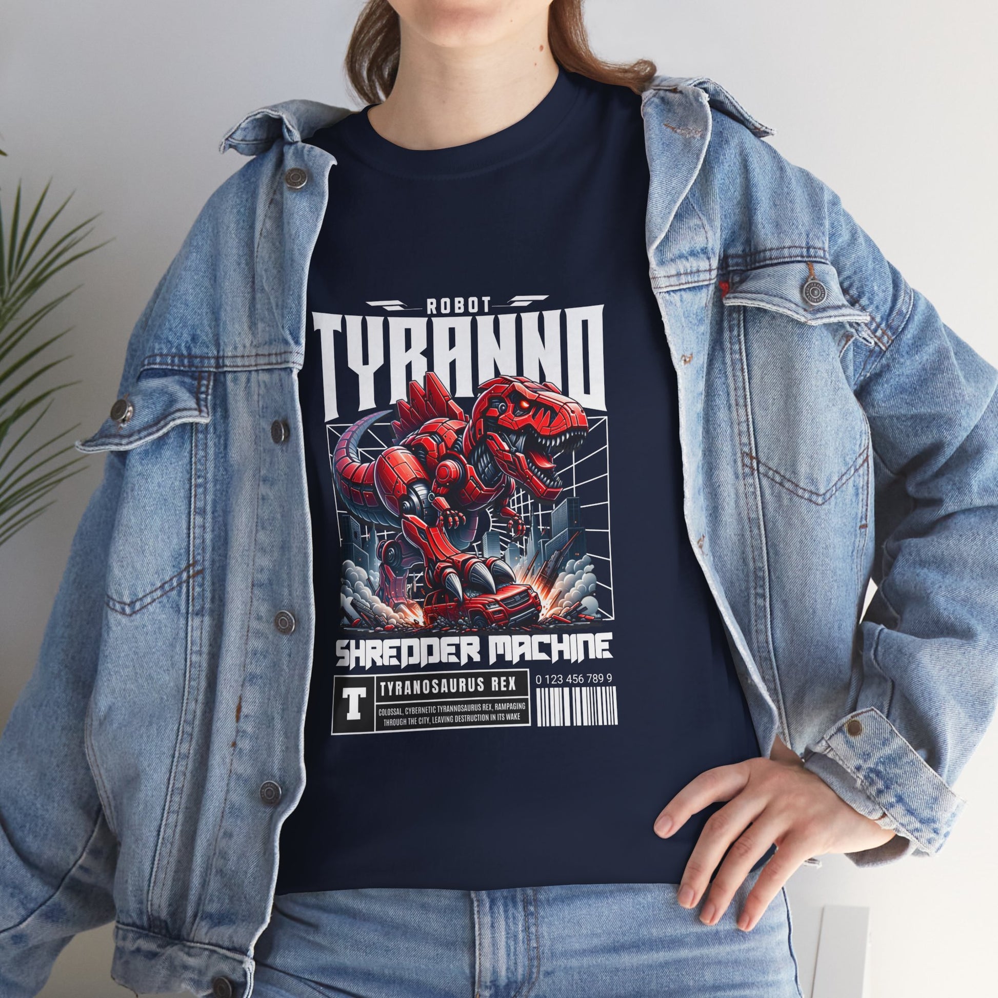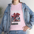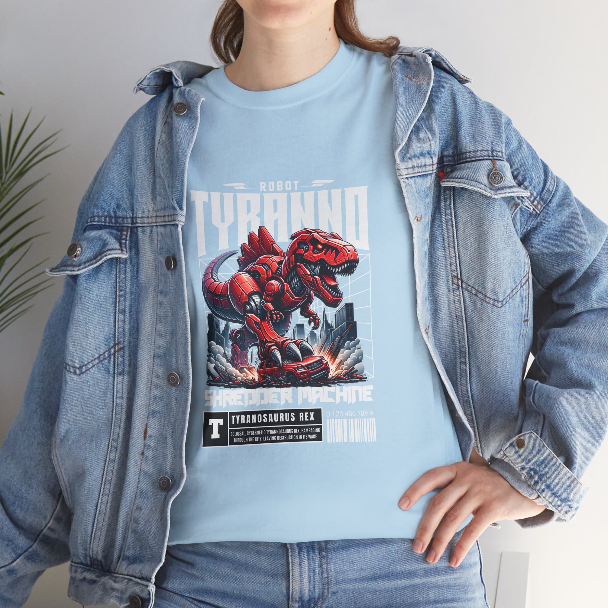 This heavyweight cotton tee brings loud, in-your-face energy to a casual wardrobe. A bold, illustrated centerpiece on the chest shows a chrome-clad Tyranno shredding through metal and sparks — retro arcade and metal-poster vibes collide. Clean, arched lettering on the upper back balances the front art so the shirt reads like a vintage concert or game-card collectible. The thicker 180 g/m² fabric and classic crew cut give it structure and a laid-back silhouette that wears well layered under a flannel or alone with distressed denim. Wear it to shows, game nights, or whenever you want apparel that feels like an anthem: gritty, graphic, and unapologetically loud.