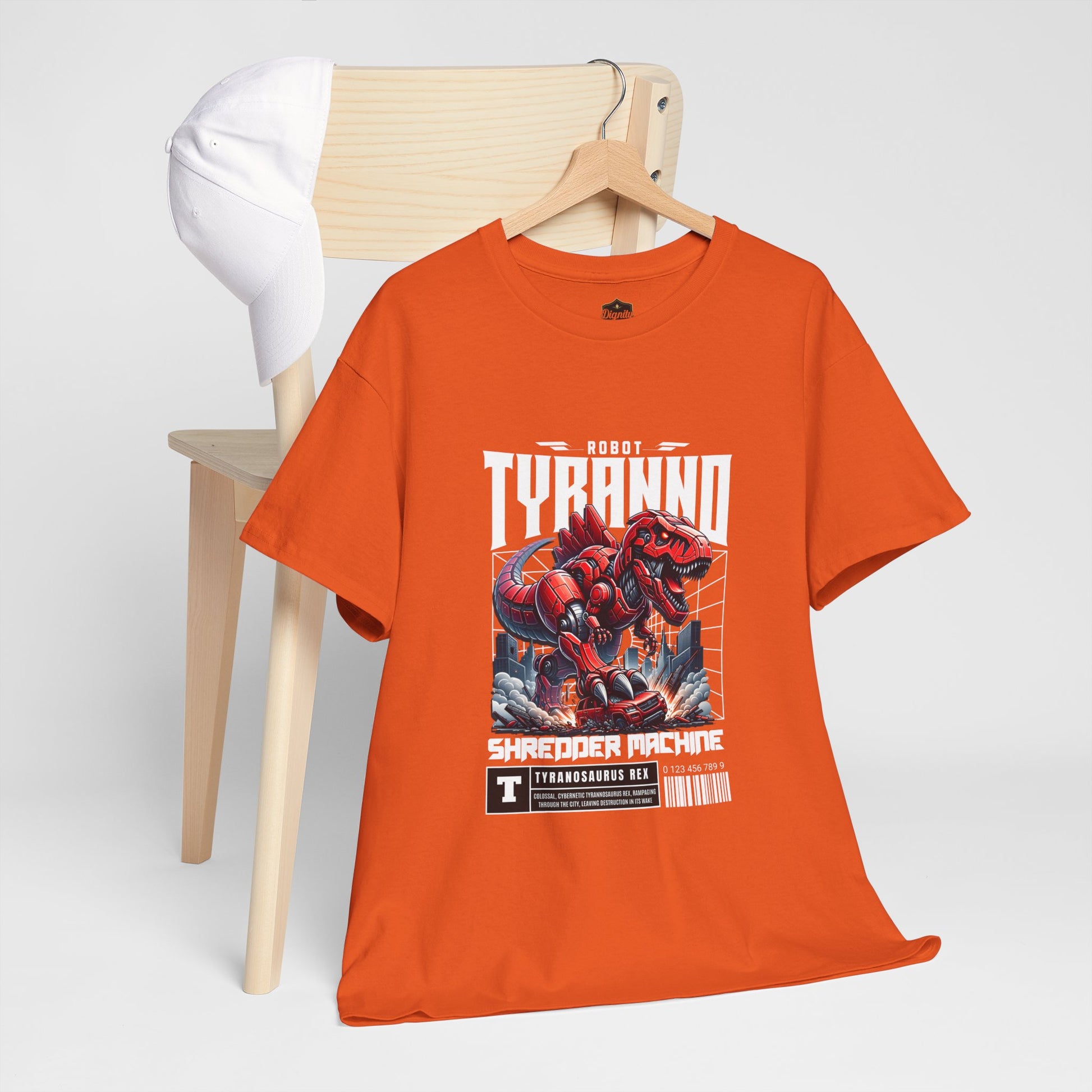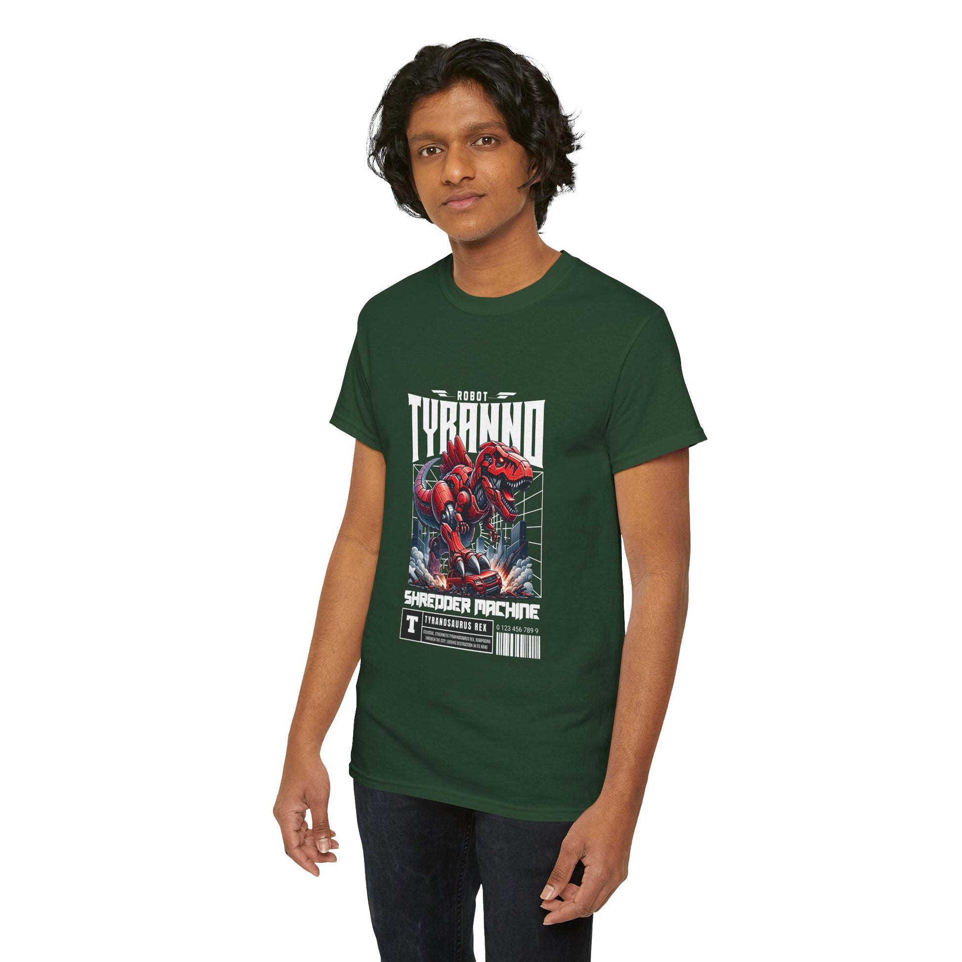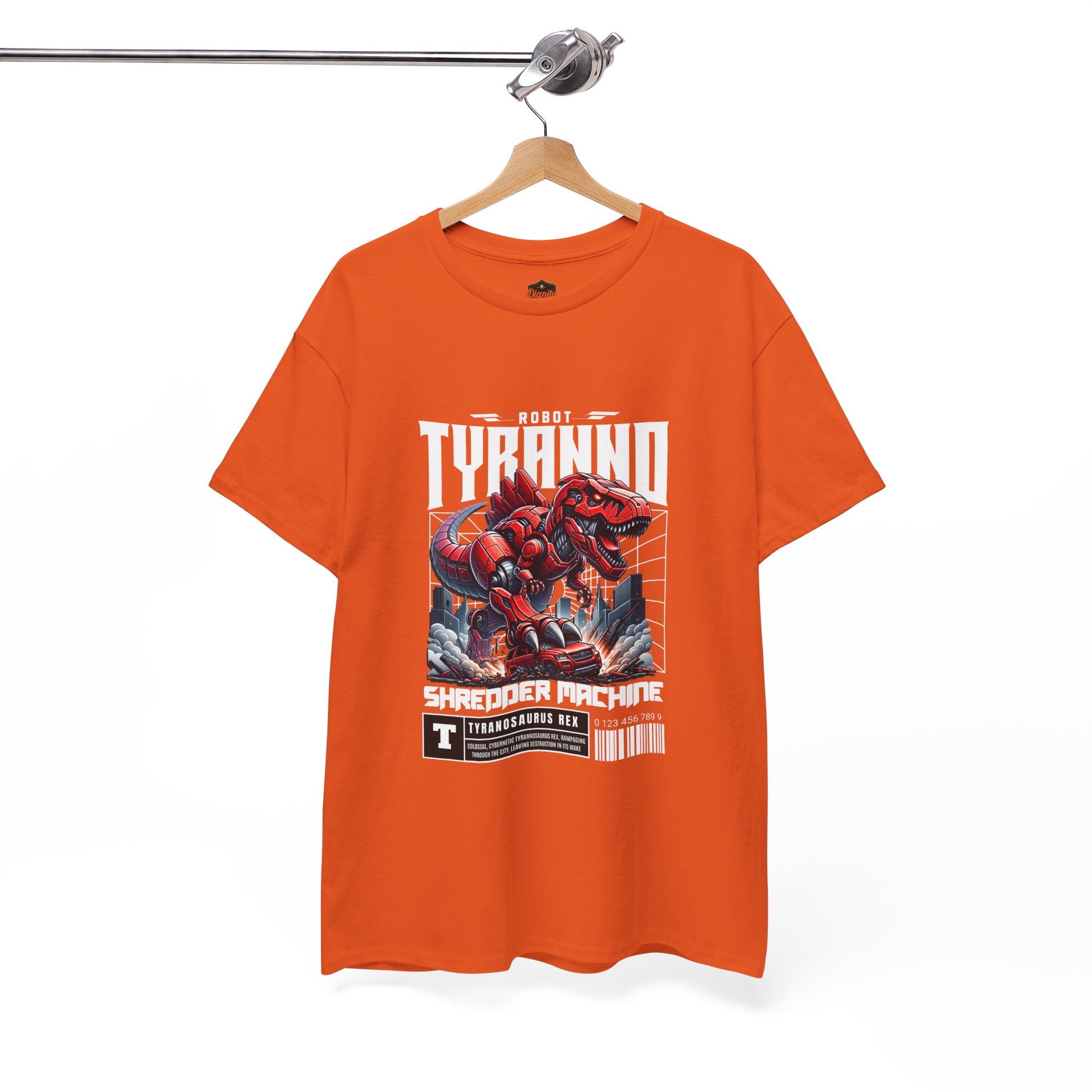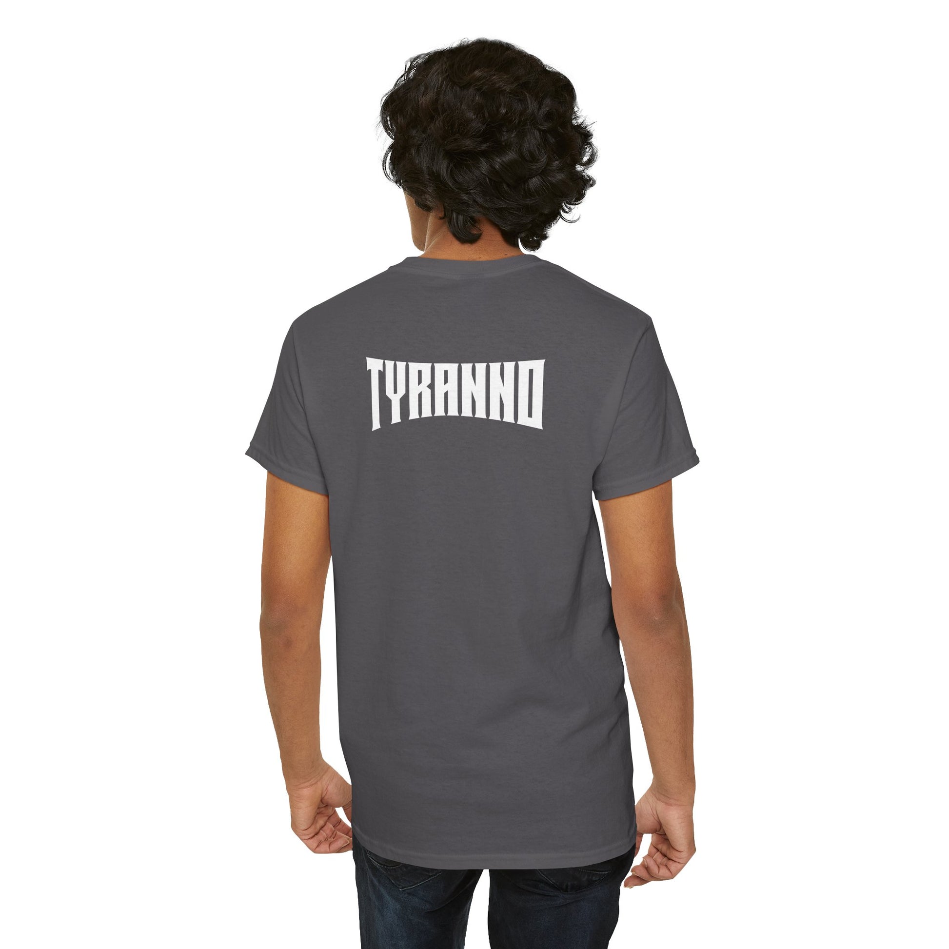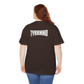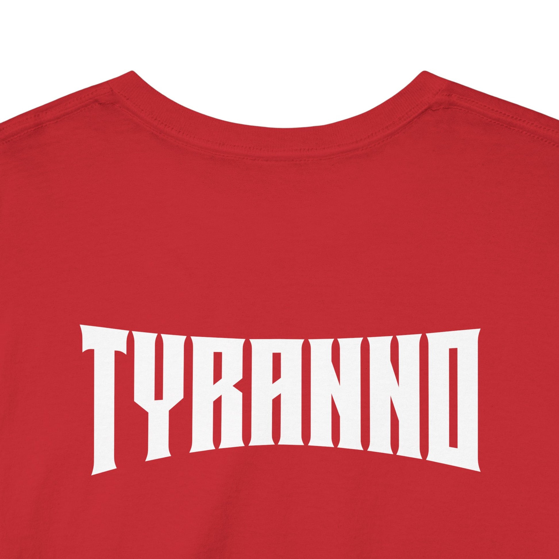 This heavyweight cotton tee brings loud, in-your-face energy to a casual wardrobe. A bold, illustrated centerpiece on the chest shows a chrome-clad Tyranno shredding through metal and sparks — retro arcade and metal-poster vibes collide. Clean, arched lettering on the upper back balances the front art so the shirt reads like a vintage concert or game-card collectible. The thicker 180 g/m² fabric and classic crew cut give it structure and a laid-back silhouette that wears well layered under a flannel or alone with distressed denim. Wear it to shows, game nights, or whenever you want apparel that feels like an anthem: gritty, graphic, and unapologetically loud.