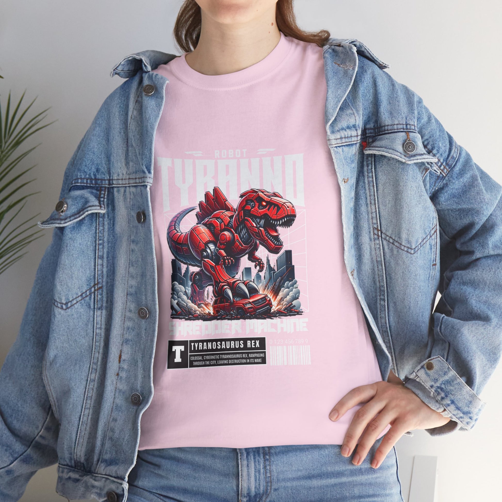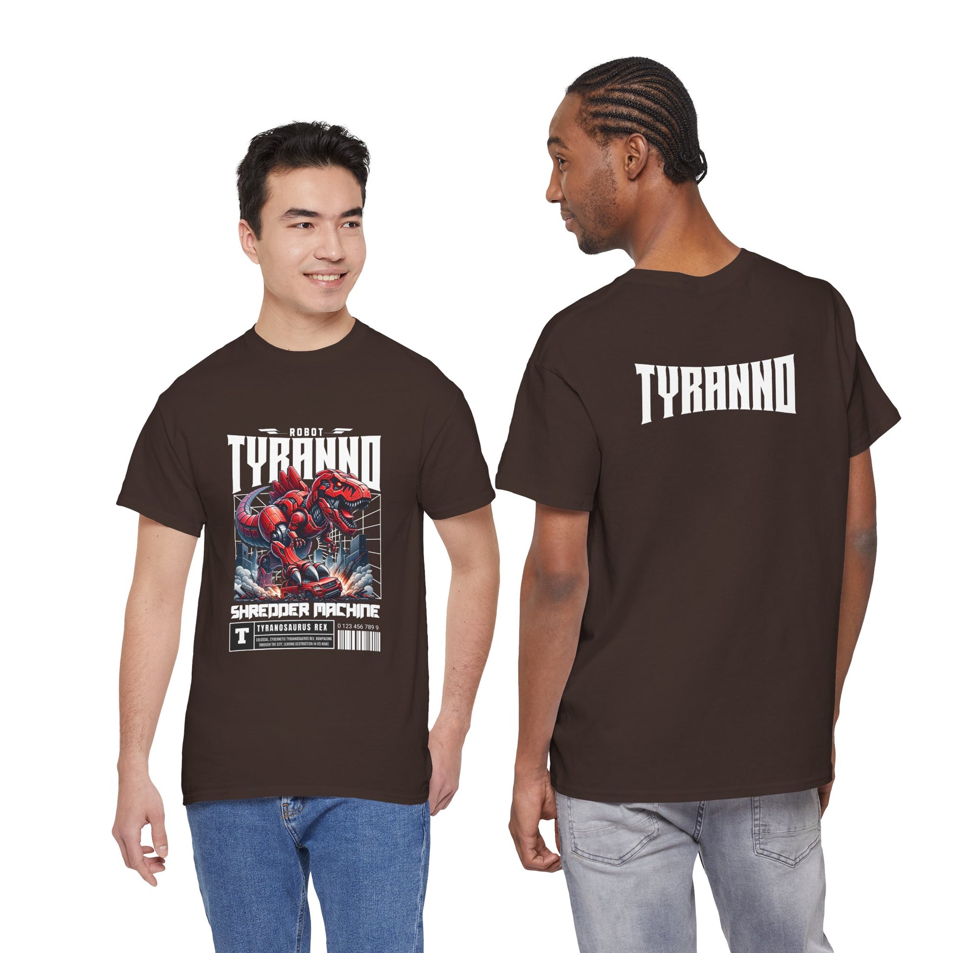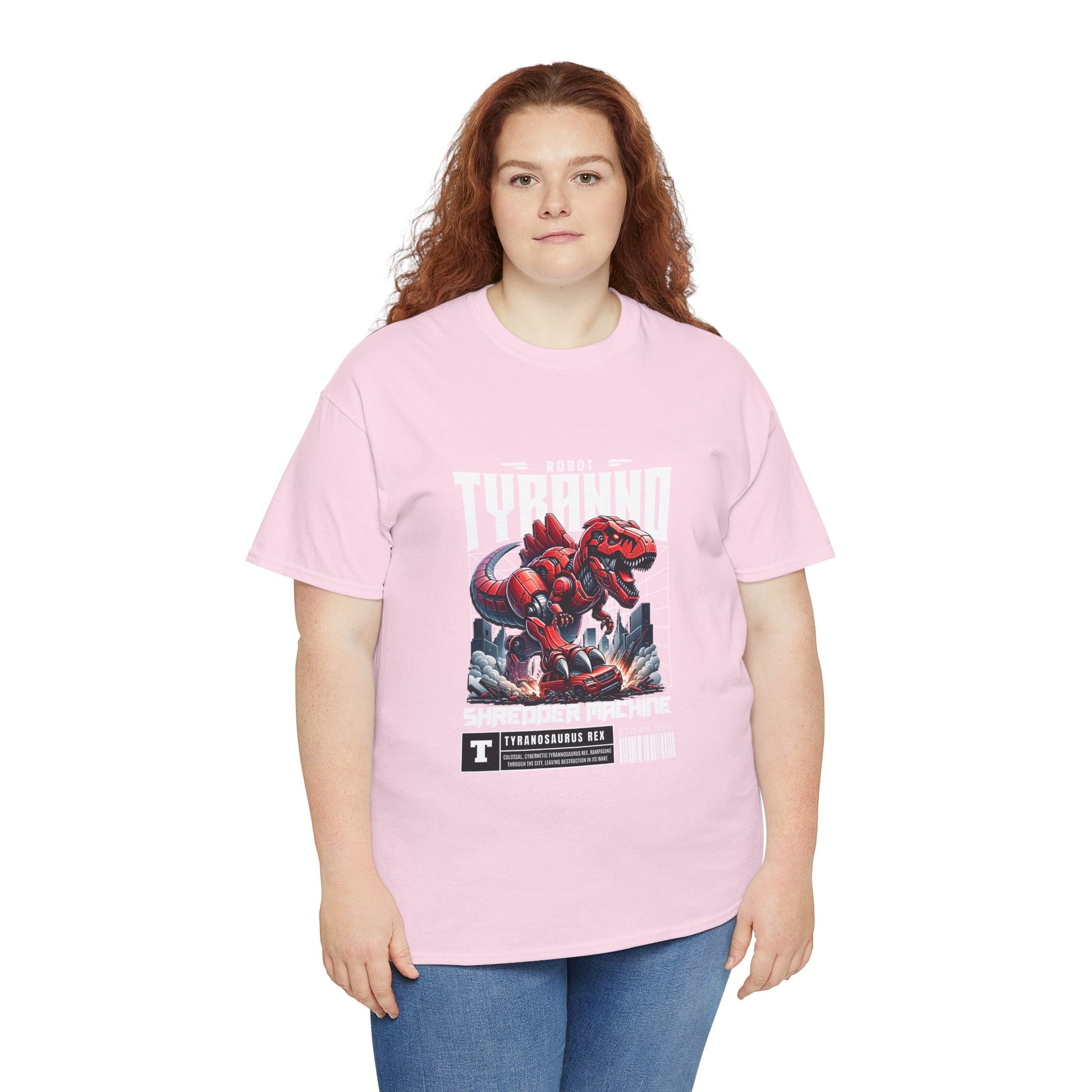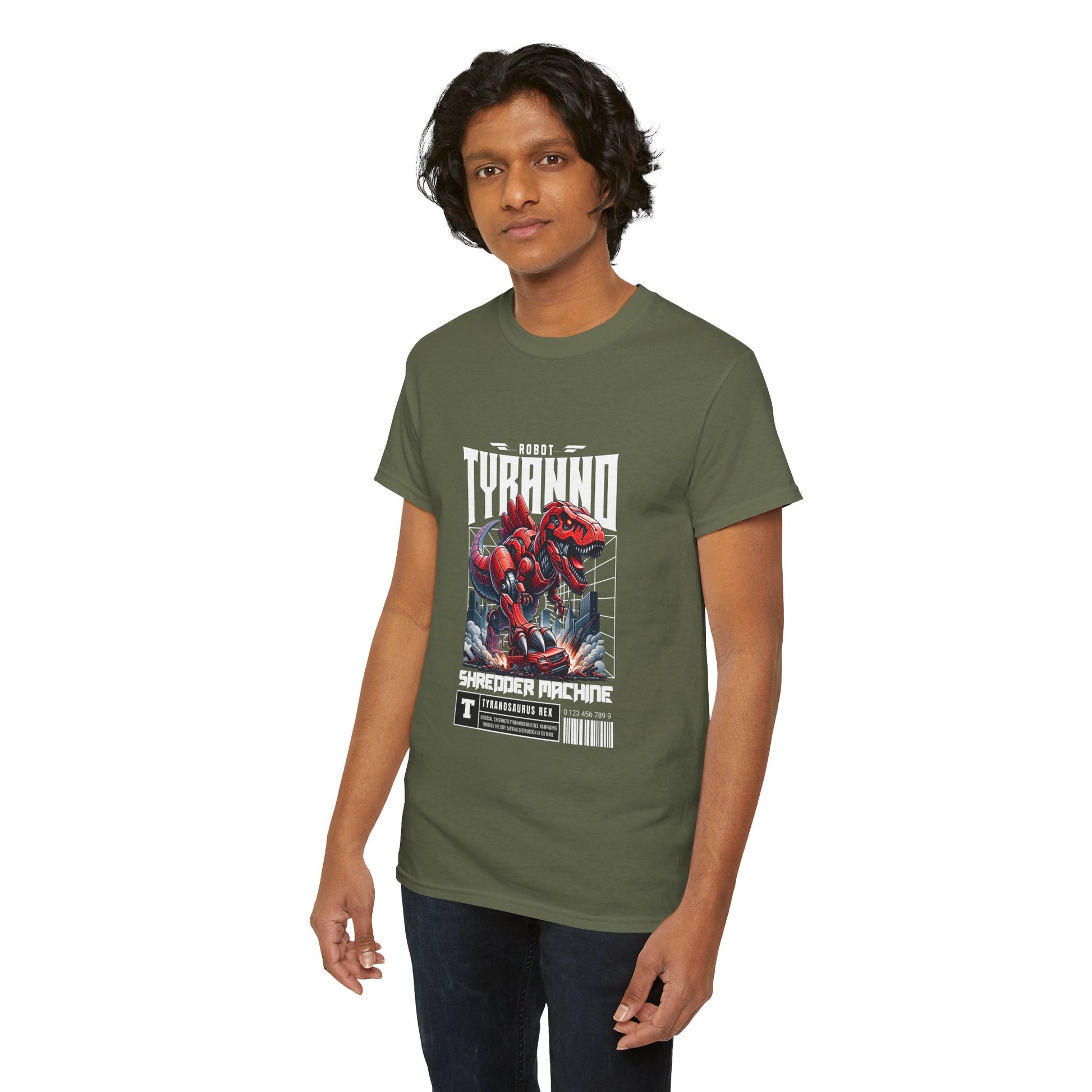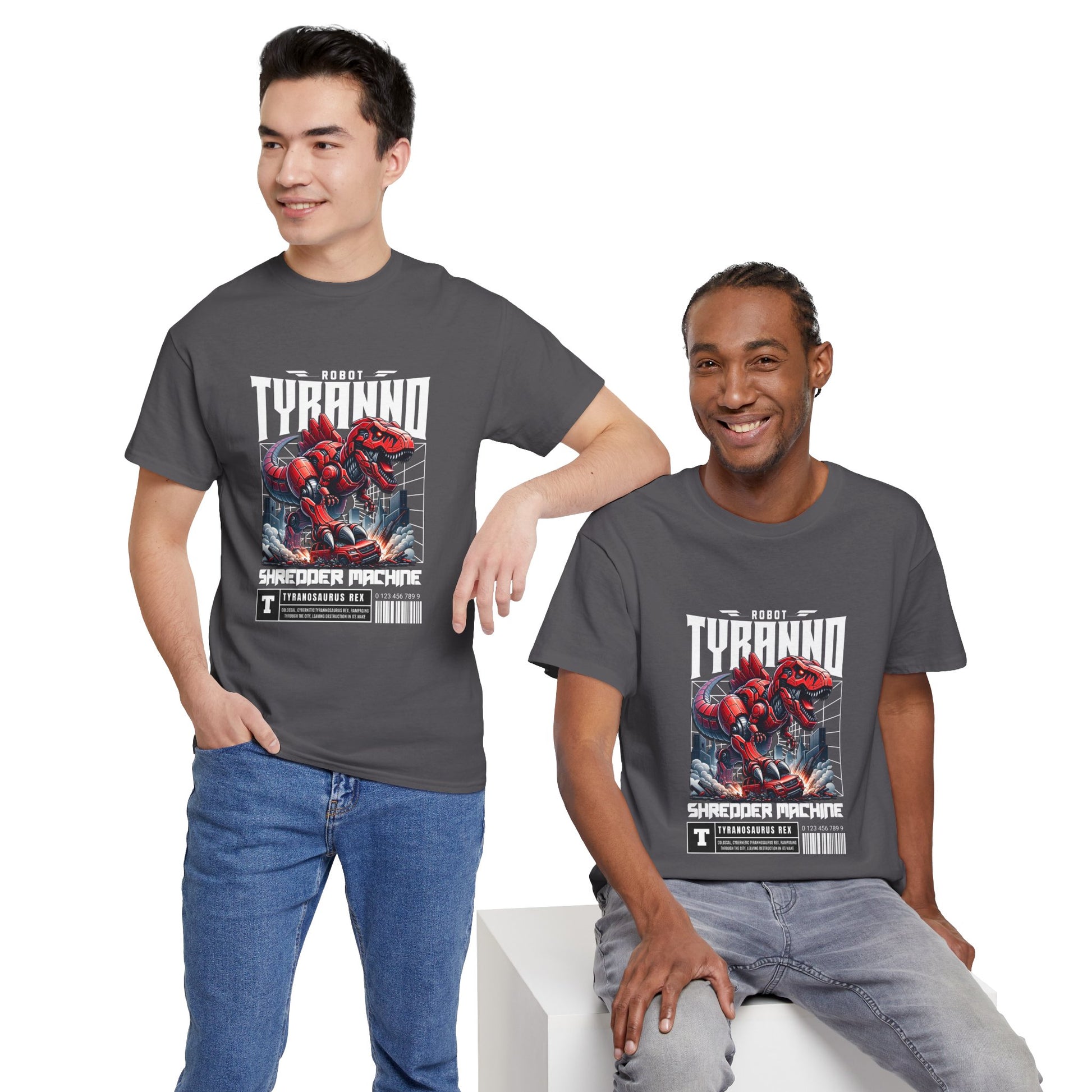 This heavyweight cotton tee brings loud, in-your-face energy to a casual wardrobe. A bold, illustrated centerpiece on the chest shows a chrome-clad Tyranno shredding through metal and sparks — retro arcade and metal-poster vibes collide. Clean, arched lettering on the upper back balances the front art so the shirt reads like a vintage concert or game-card collectible. The thicker 180 g/m² fabric and classic crew cut give it structure and a laid-back silhouette that wears well layered under a flannel or alone with distressed denim. Wear it to shows, game nights, or whenever you want apparel that feels like an anthem: gritty, graphic, and unapologetically loud.