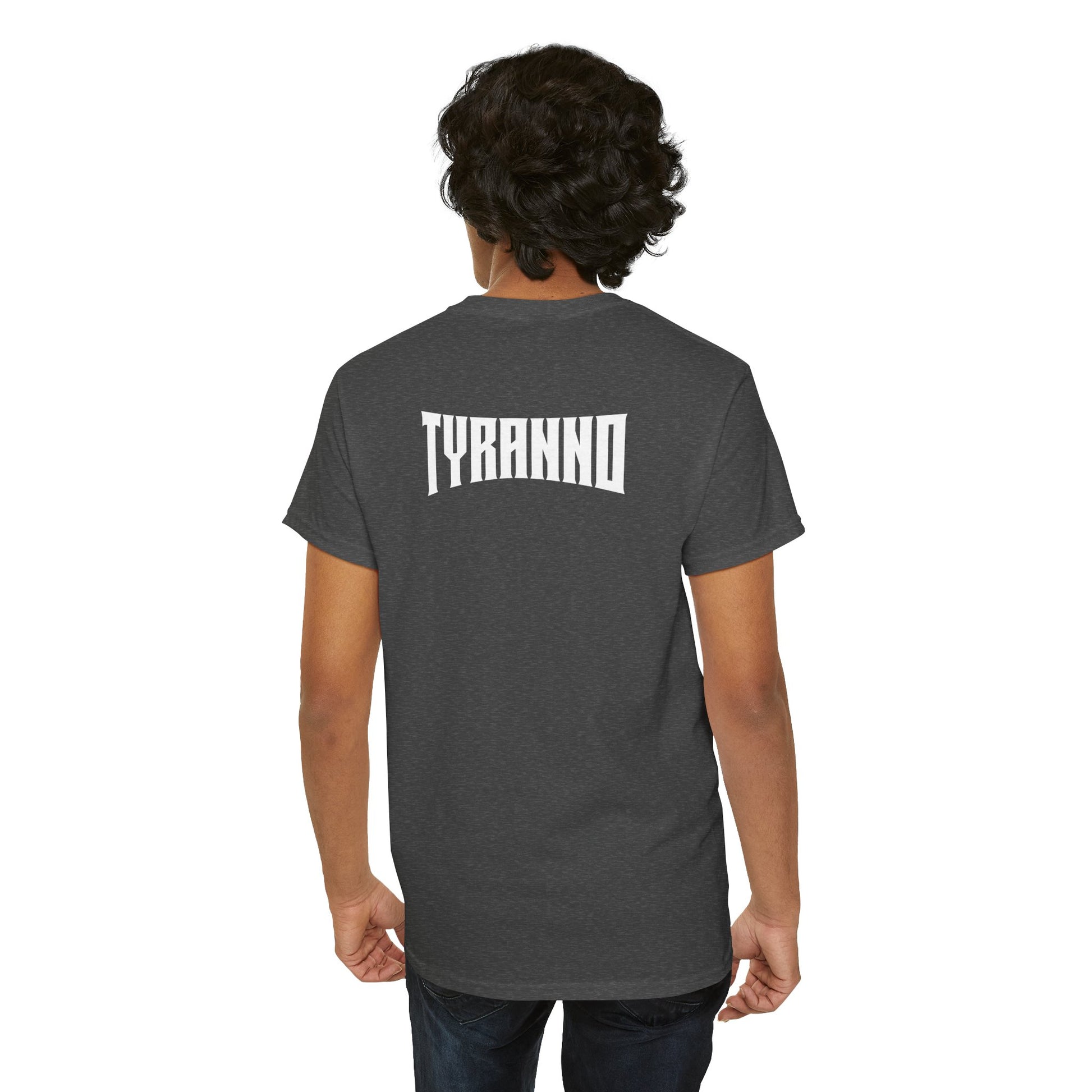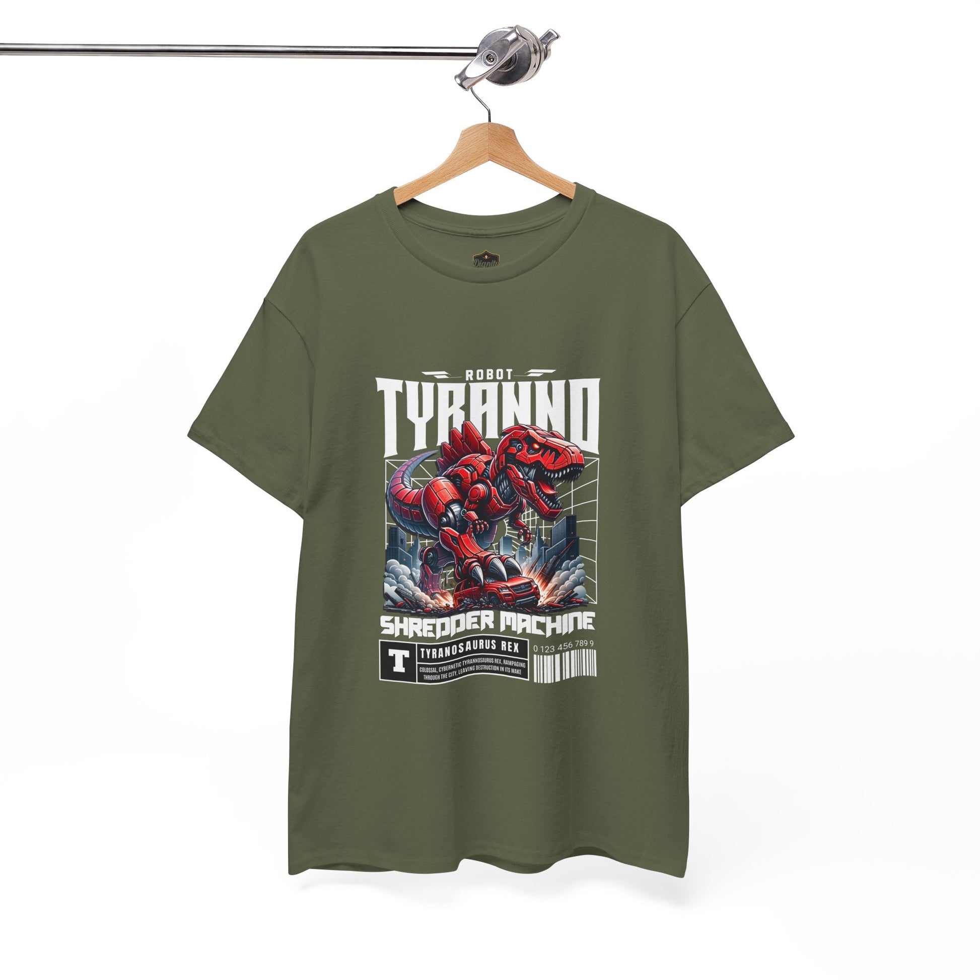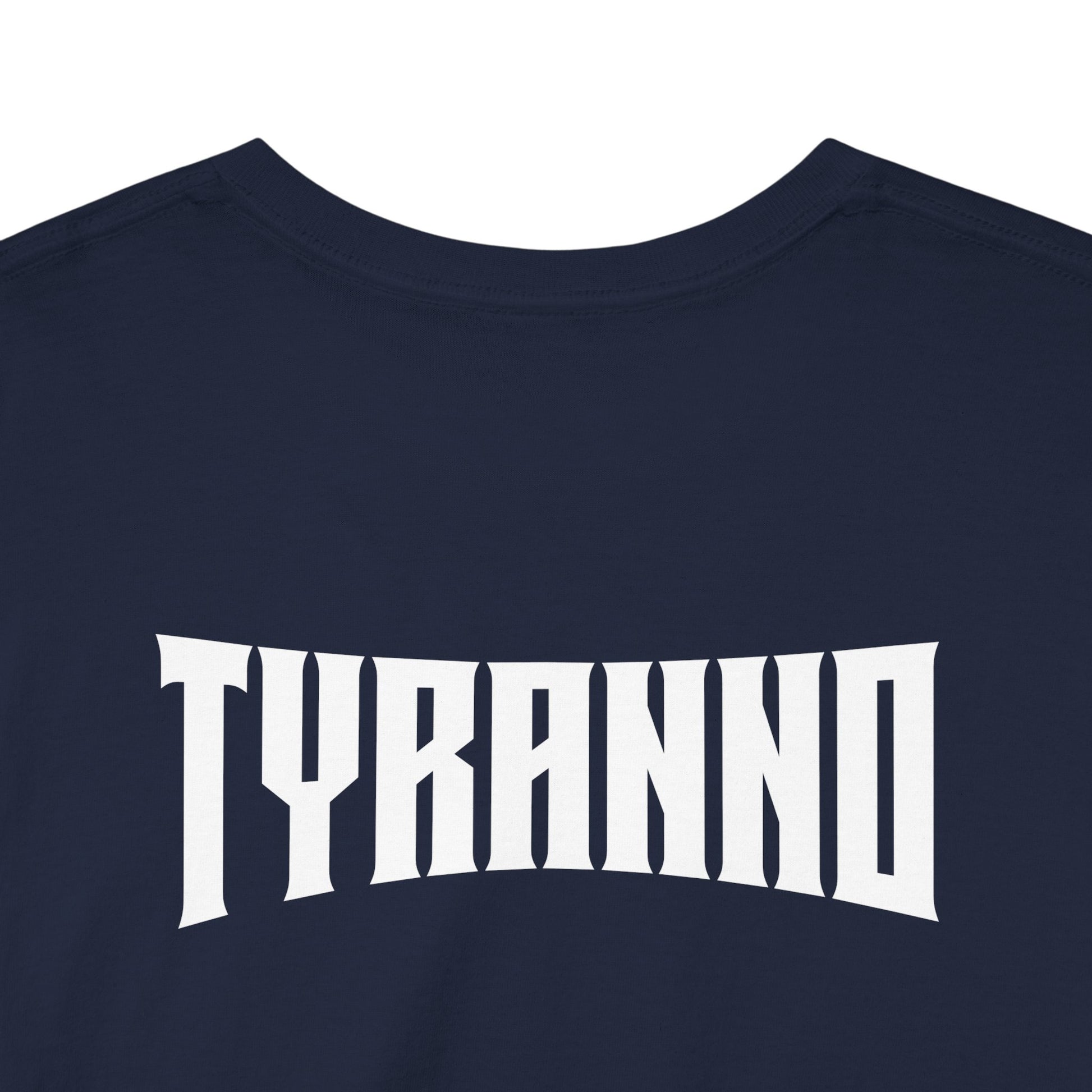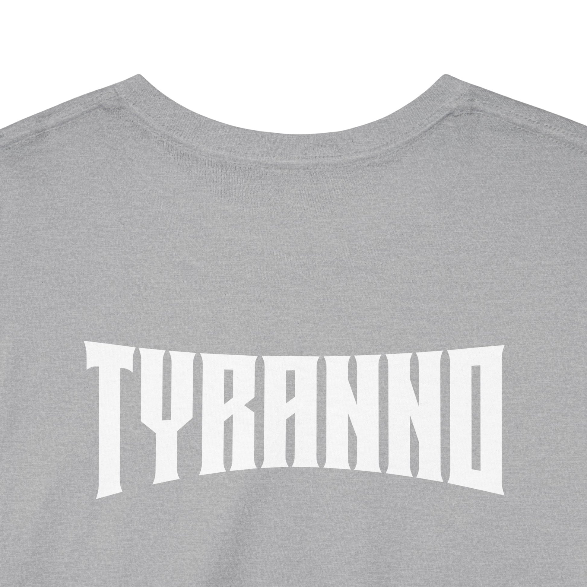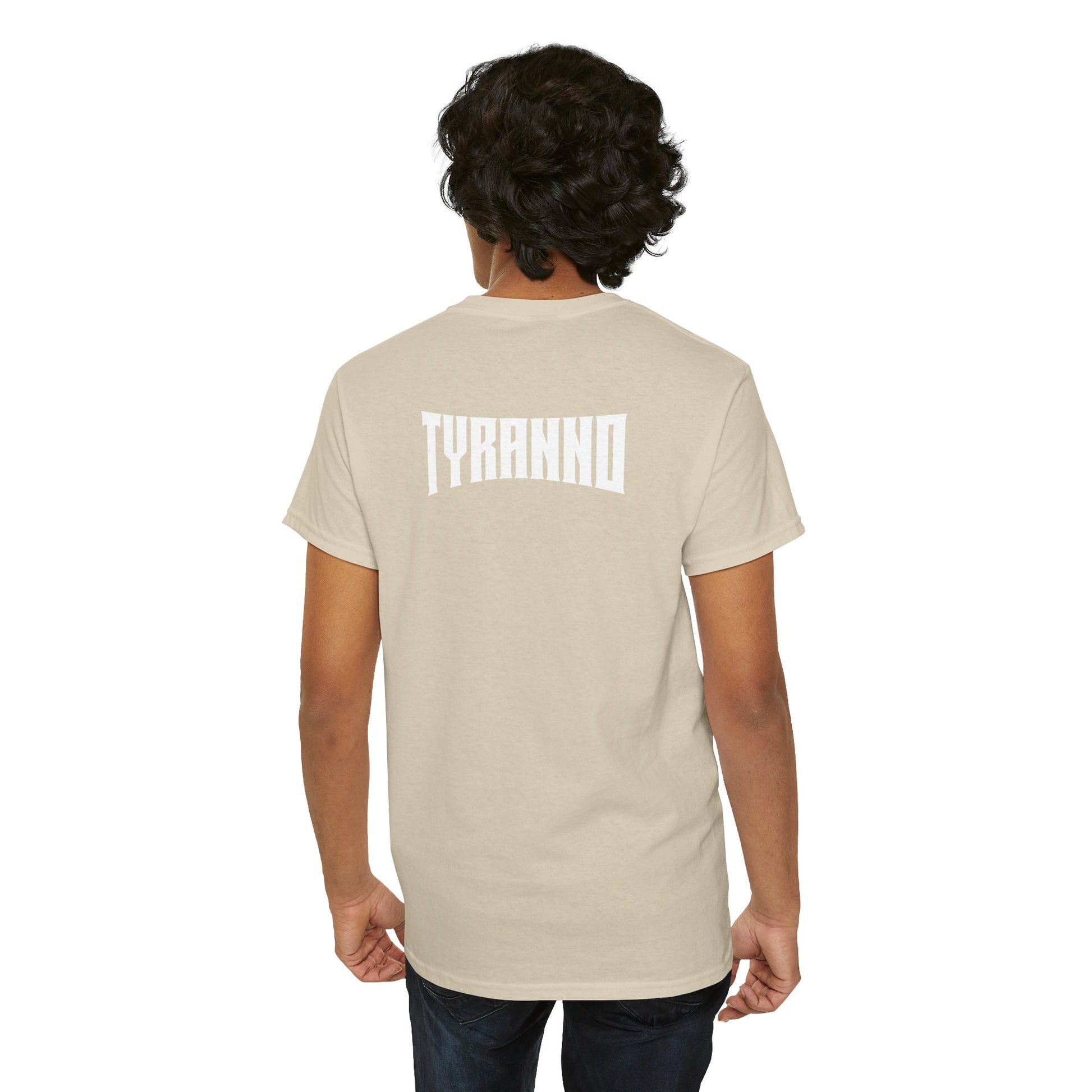 This heavyweight cotton tee brings loud, in-your-face energy to a casual wardrobe. A bold, illustrated centerpiece on the chest shows a chrome-clad Tyranno shredding through metal and sparks — retro arcade and metal-poster vibes collide. Clean, arched lettering on the upper back balances the front art so the shirt reads like a vintage concert or game-card collectible. The thicker 180 g/m² fabric and classic crew cut give it structure and a laid-back silhouette that wears well layered under a flannel or alone with distressed denim. Wear it to shows, game nights, or whenever you want apparel that feels like an anthem: gritty, graphic, and unapologetically loud.