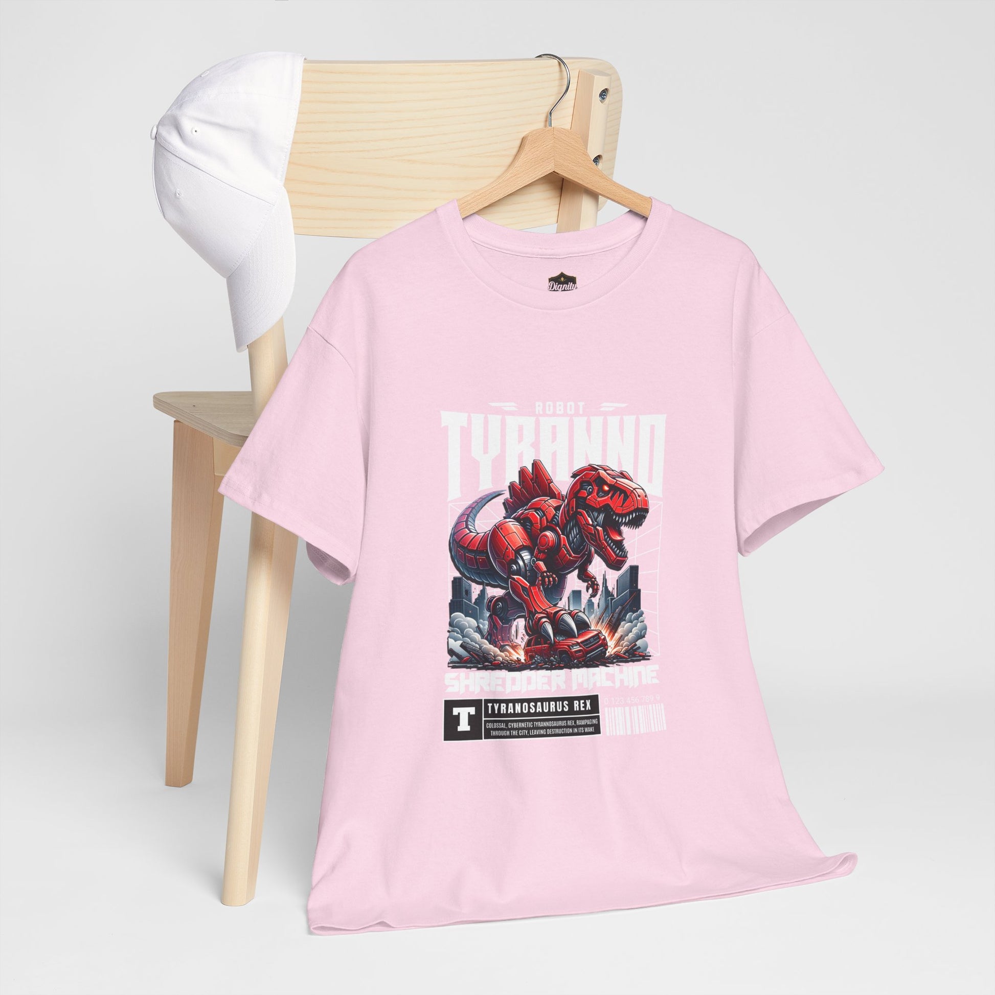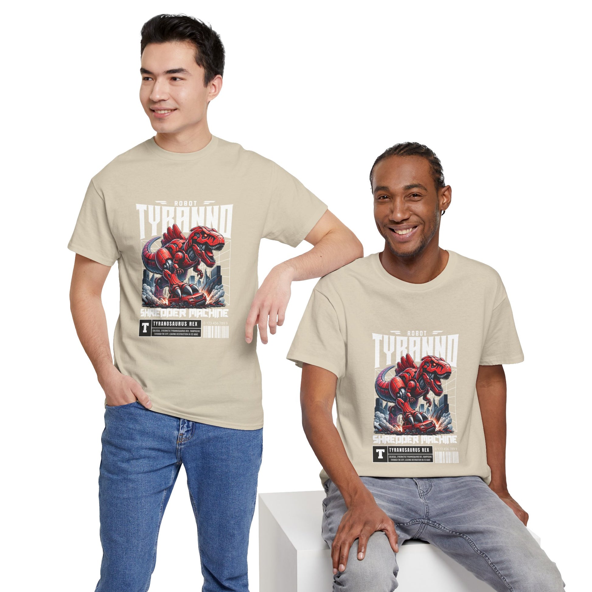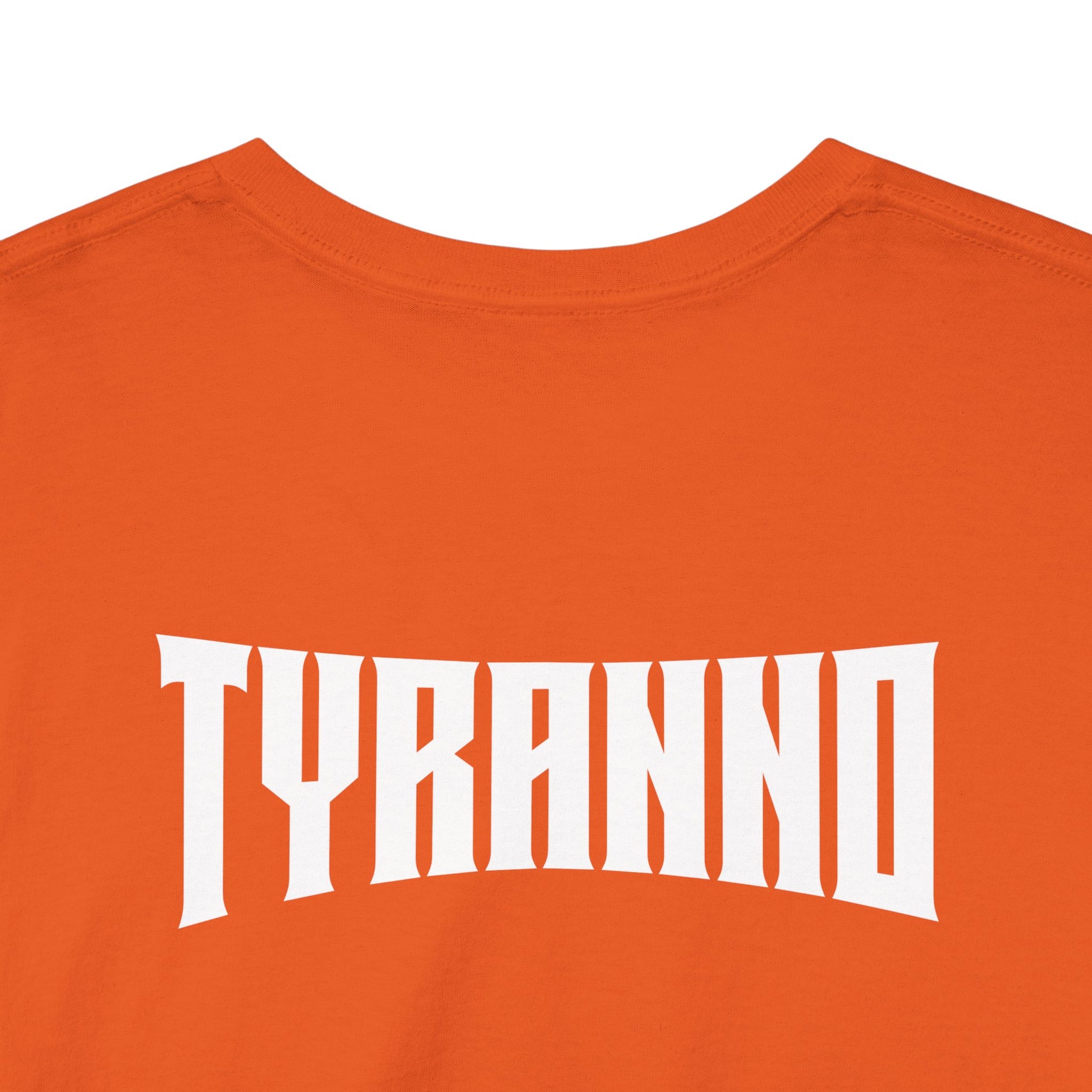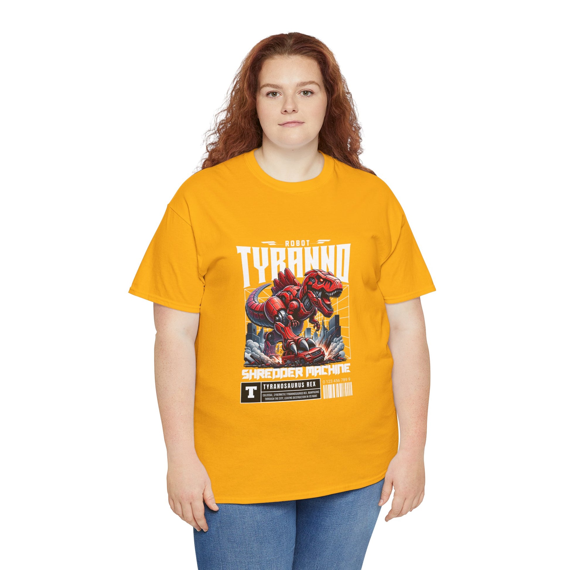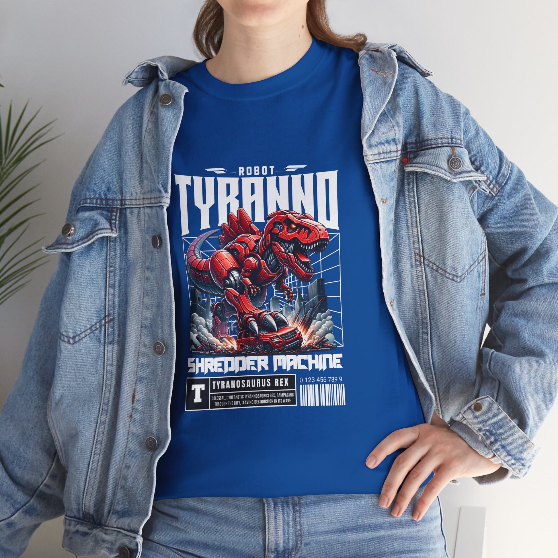 This heavyweight cotton tee brings loud, in-your-face energy to a casual wardrobe. A bold, illustrated centerpiece on the chest shows a chrome-clad Tyranno shredding through metal and sparks — retro arcade and metal-poster vibes collide. Clean, arched lettering on the upper back balances the front art so the shirt reads like a vintage concert or game-card collectible. The thicker 180 g/m² fabric and classic crew cut give it structure and a laid-back silhouette that wears well layered under a flannel or alone with distressed denim. Wear it to shows, game nights, or whenever you want apparel that feels like an anthem: gritty, graphic, and unapologetically loud.