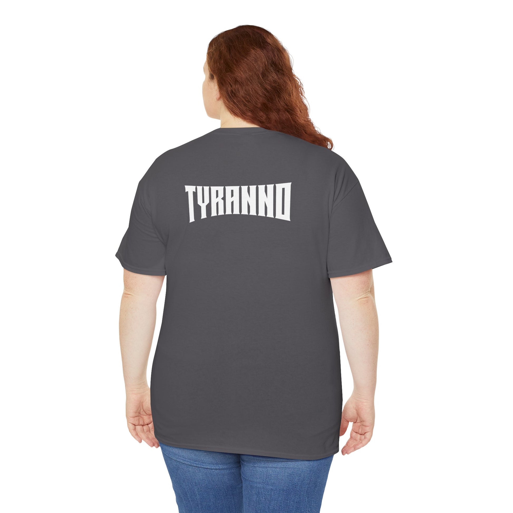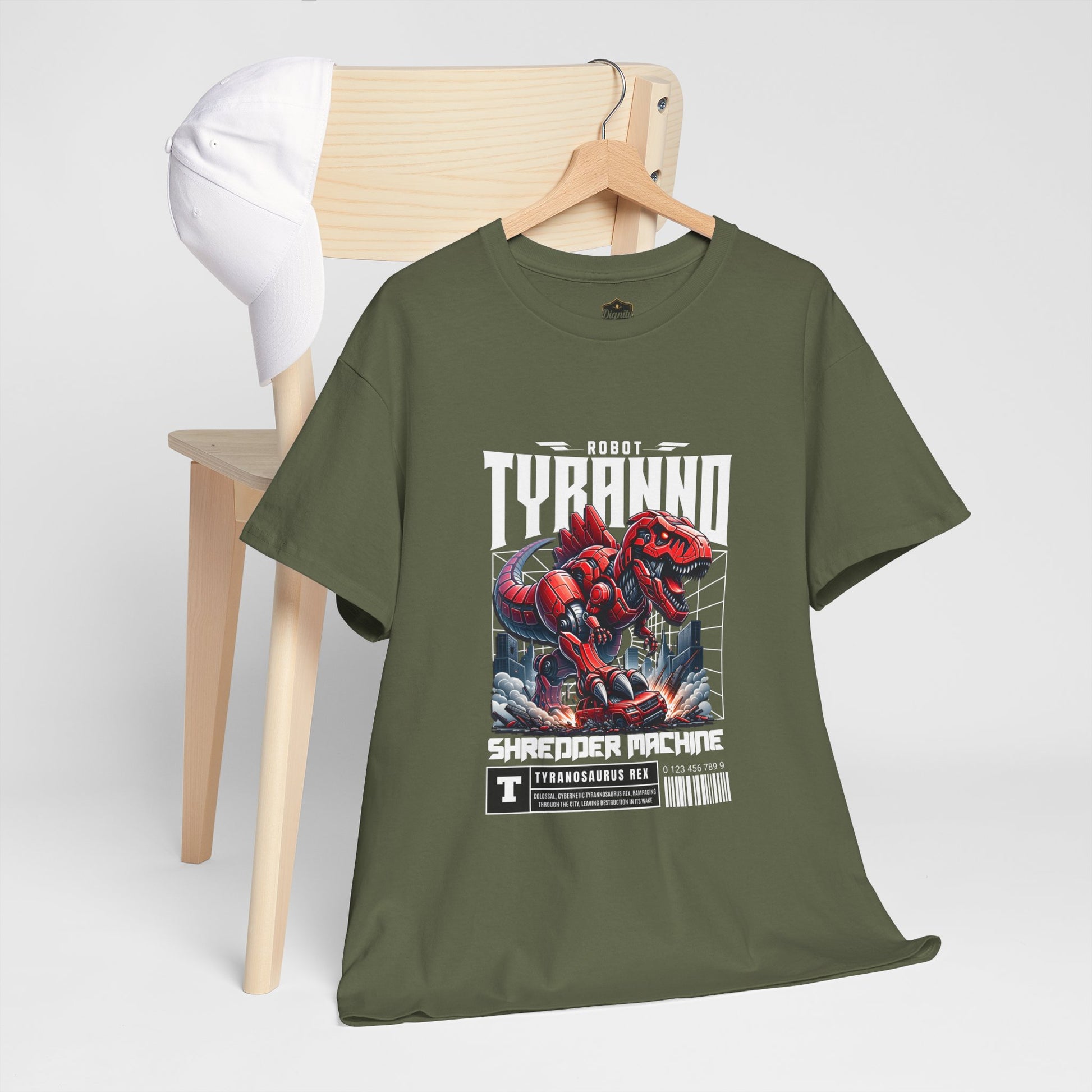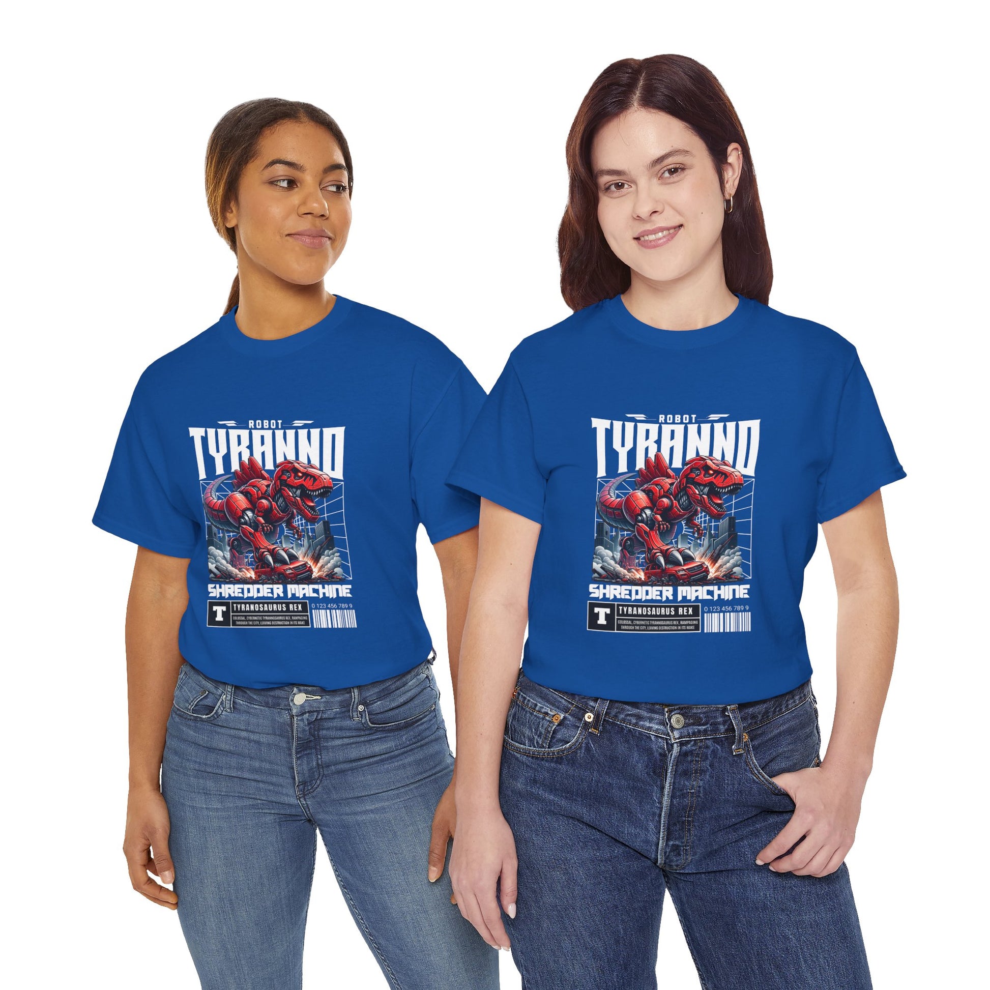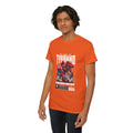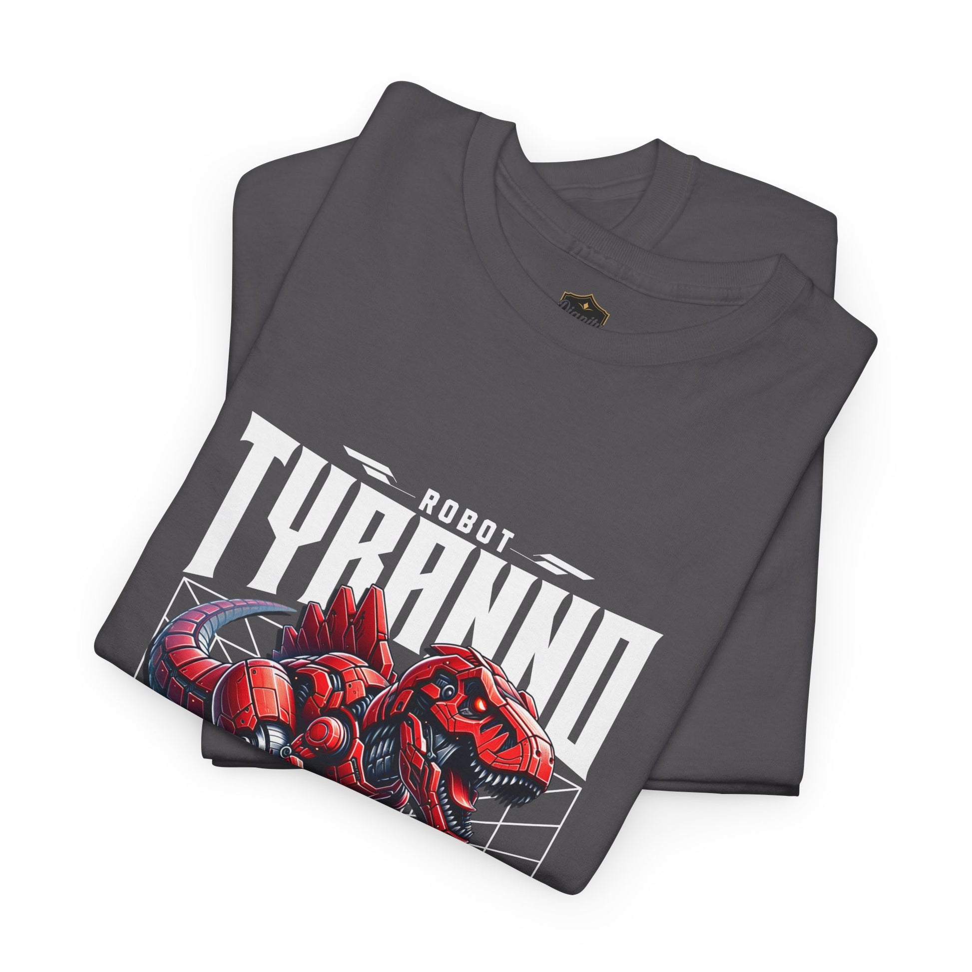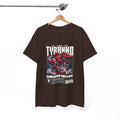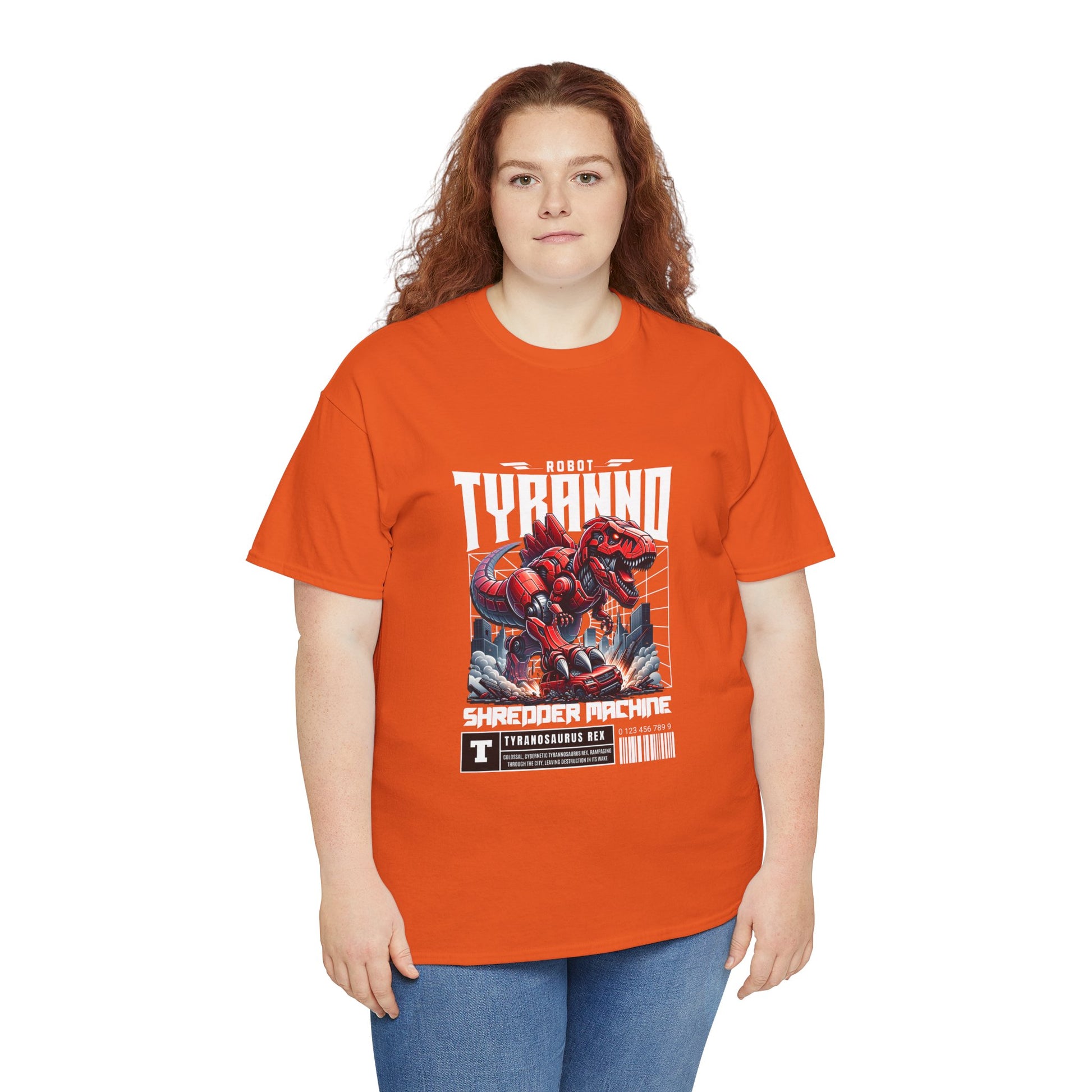 This heavyweight cotton tee brings loud, in-your-face energy to a casual wardrobe. A bold, illustrated centerpiece on the chest shows a chrome-clad Tyranno shredding through metal and sparks — retro arcade and metal-poster vibes collide. Clean, arched lettering on the upper back balances the front art so the shirt reads like a vintage concert or game-card collectible. The thicker 180 g/m² fabric and classic crew cut give it structure and a laid-back silhouette that wears well layered under a flannel or alone with distressed denim. Wear it to shows, game nights, or whenever you want apparel that feels like an anthem: gritty, graphic, and unapologetically loud.