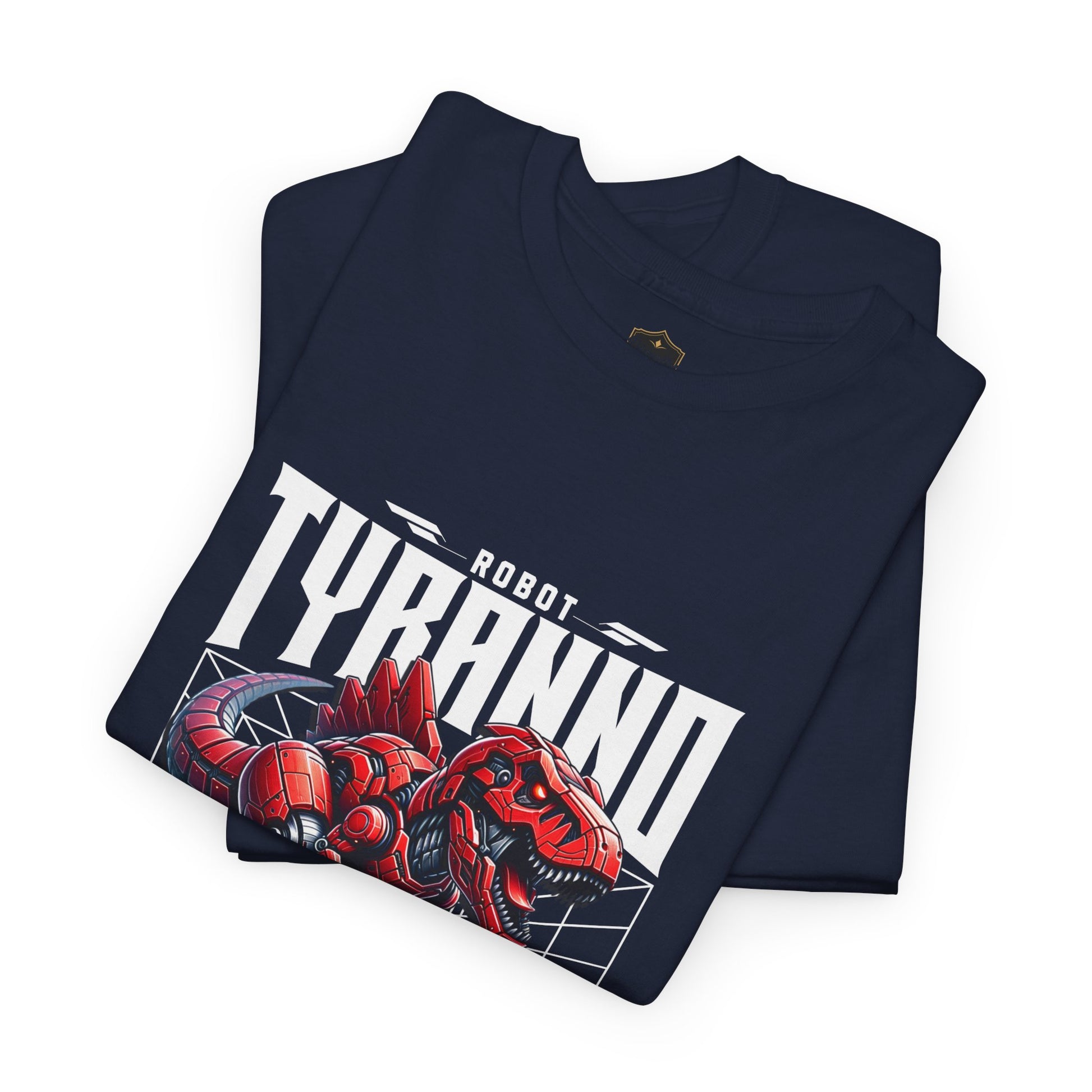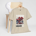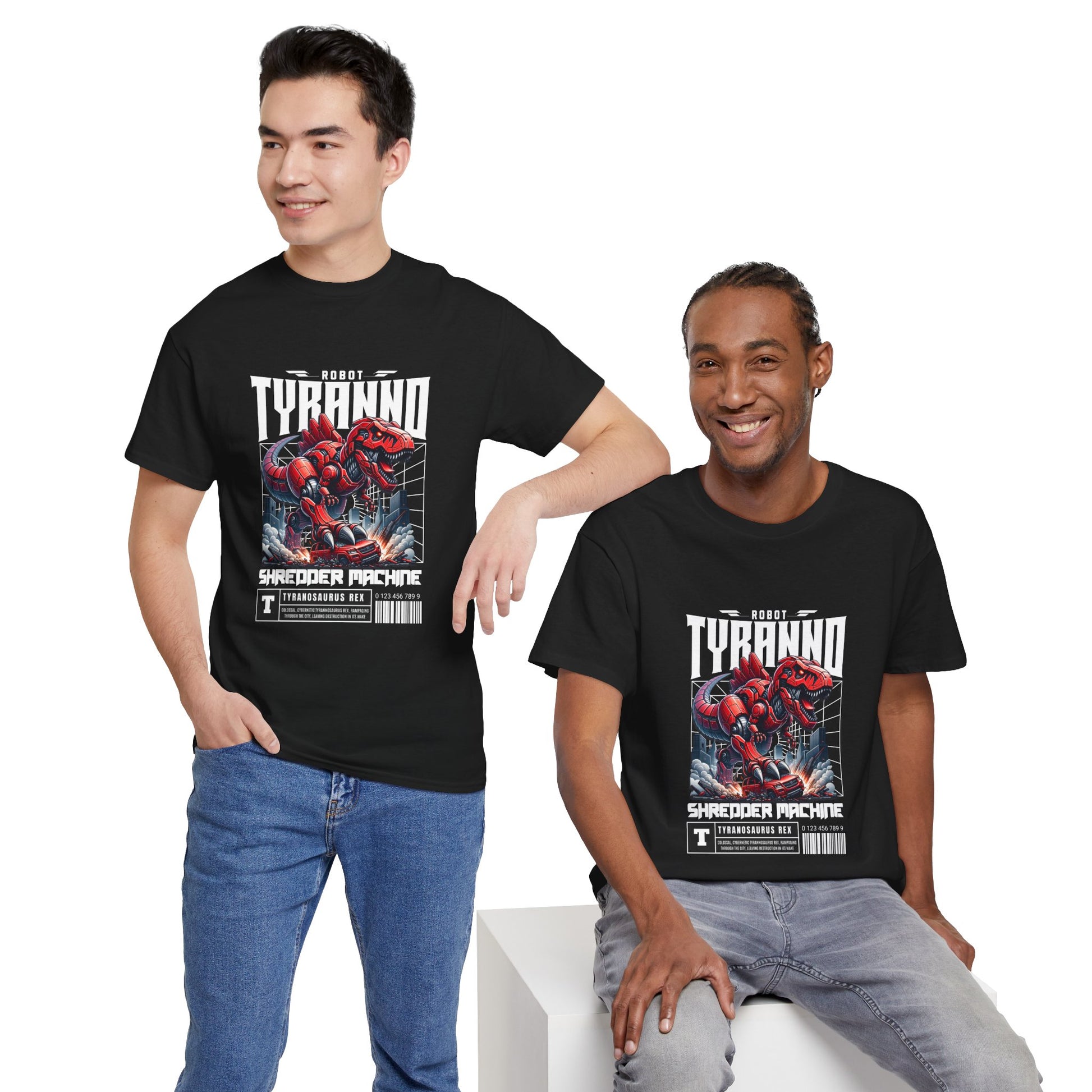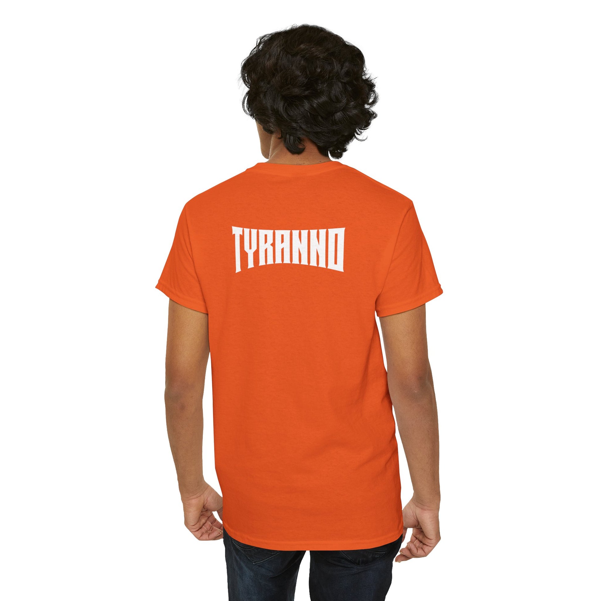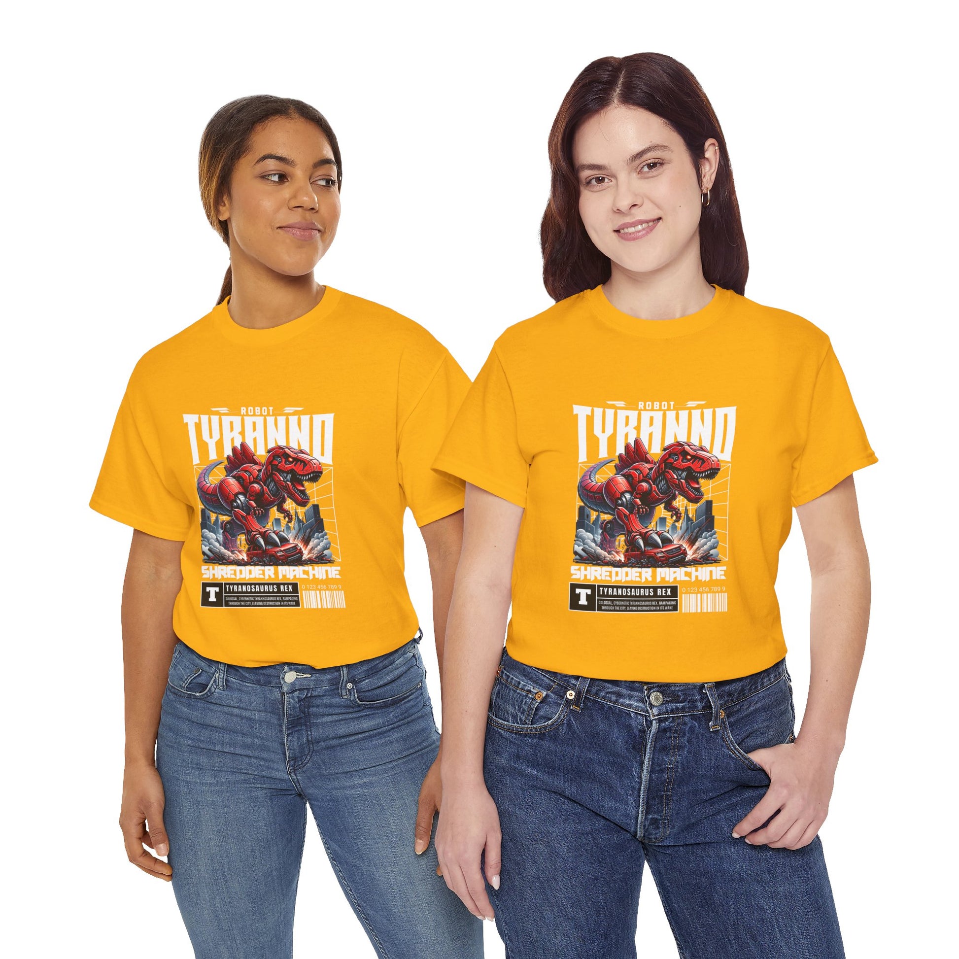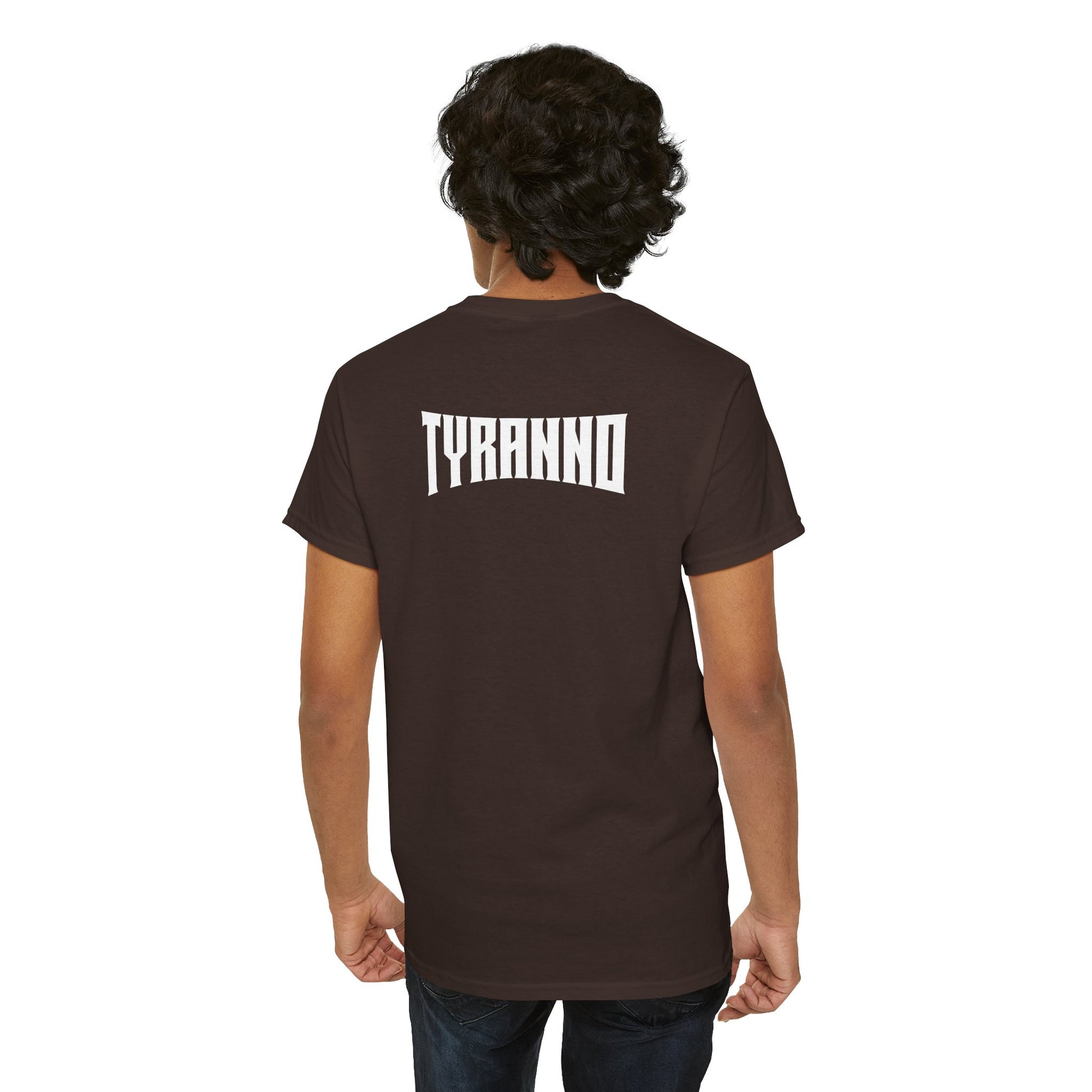 This heavyweight cotton tee brings loud, in-your-face energy to a casual wardrobe. A bold, illustrated centerpiece on the chest shows a chrome-clad Tyranno shredding through metal and sparks — retro arcade and metal-poster vibes collide. Clean, arched lettering on the upper back balances the front art so the shirt reads like a vintage concert or game-card collectible. The thicker 180 g/m² fabric and classic crew cut give it structure and a laid-back silhouette that wears well layered under a flannel or alone with distressed denim. Wear it to shows, game nights, or whenever you want apparel that feels like an anthem: gritty, graphic, and unapologetically loud.