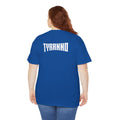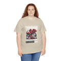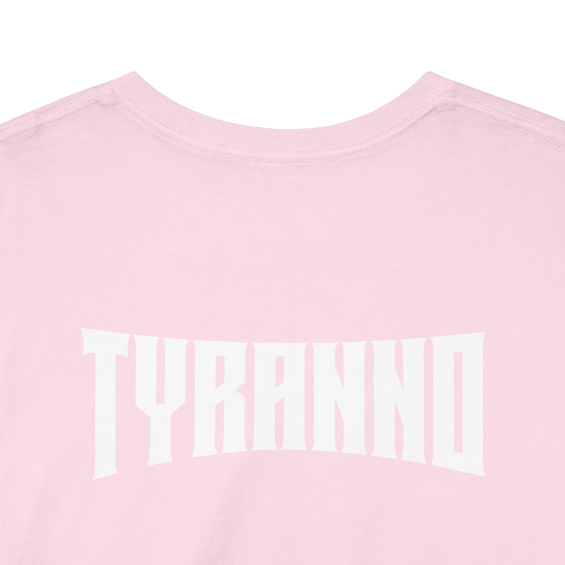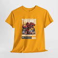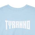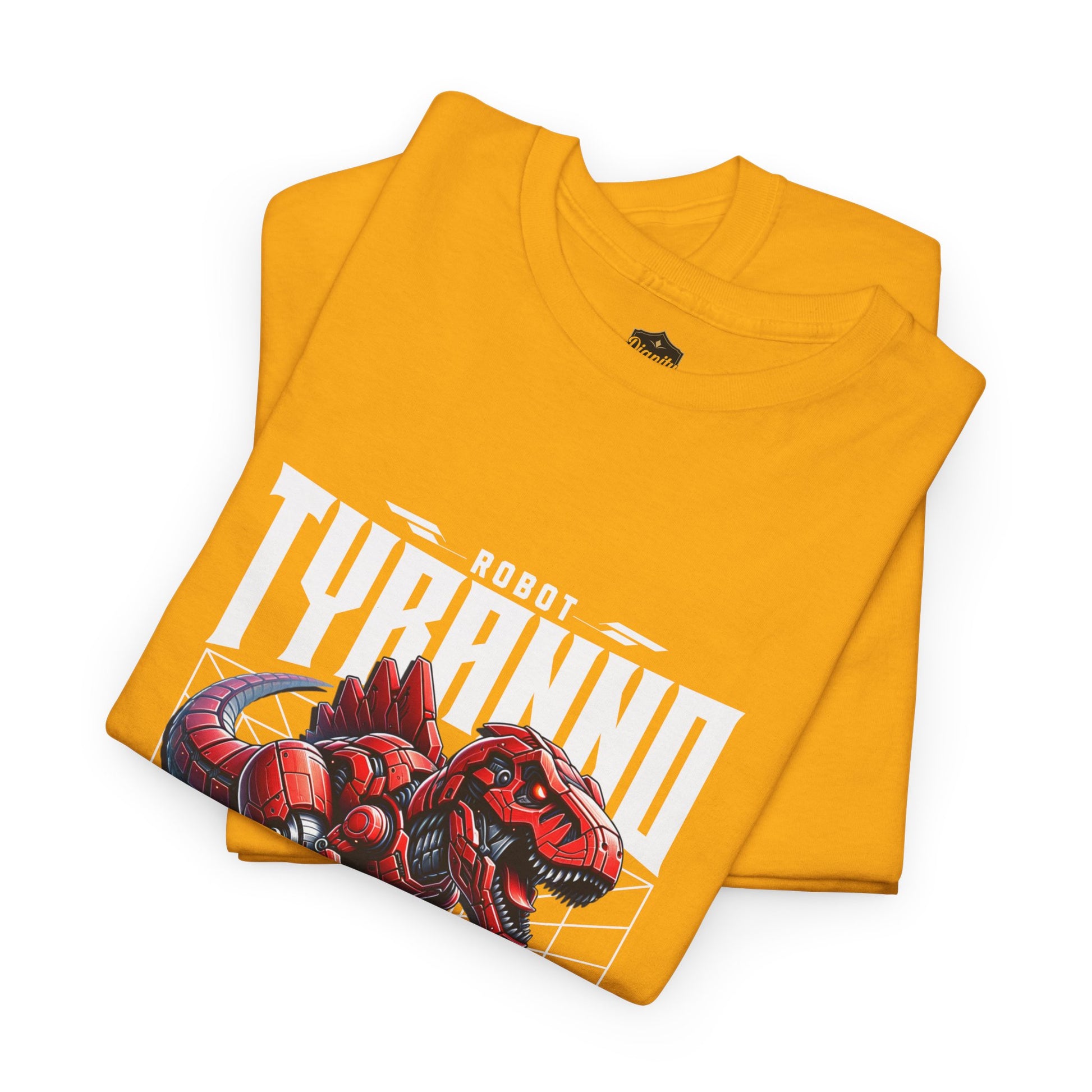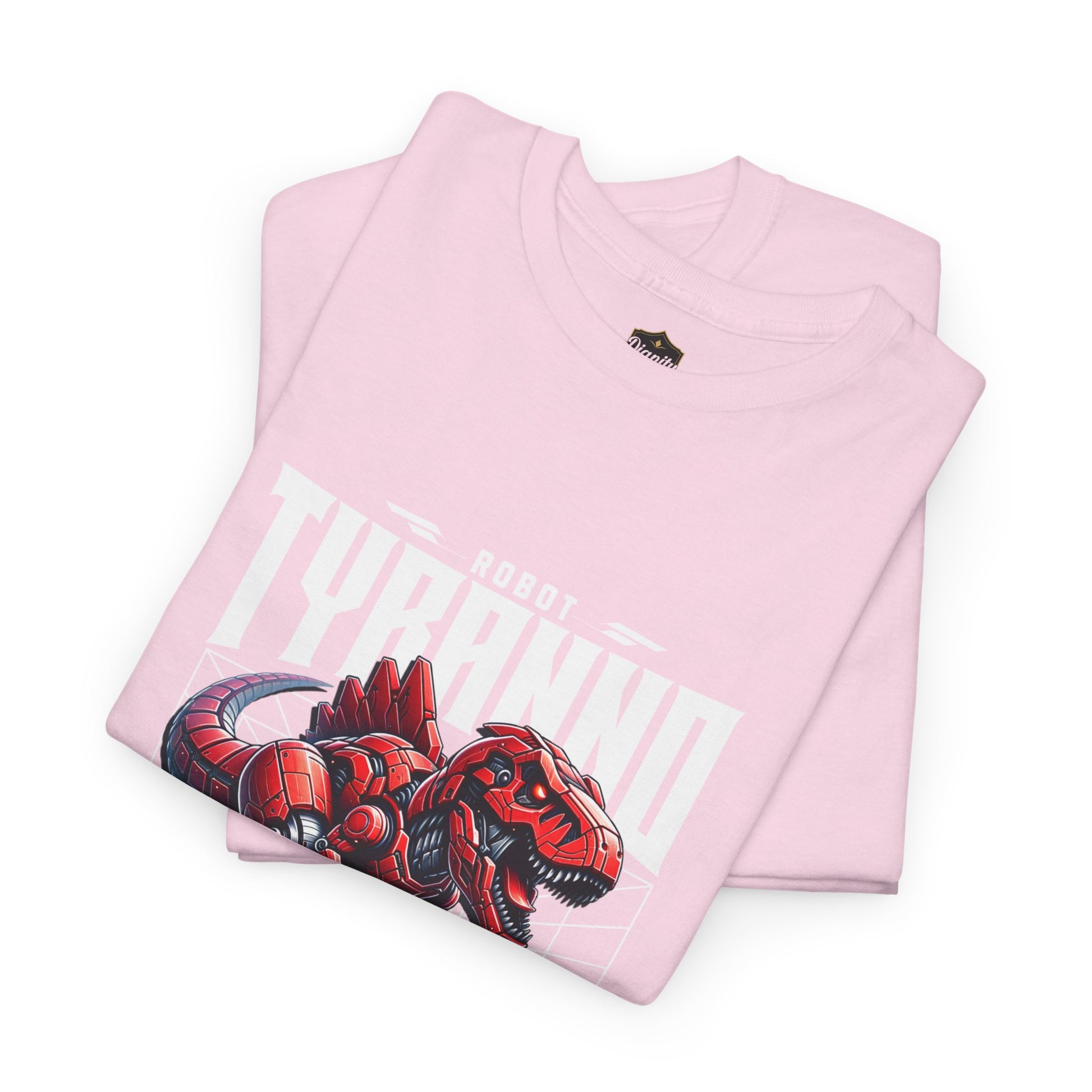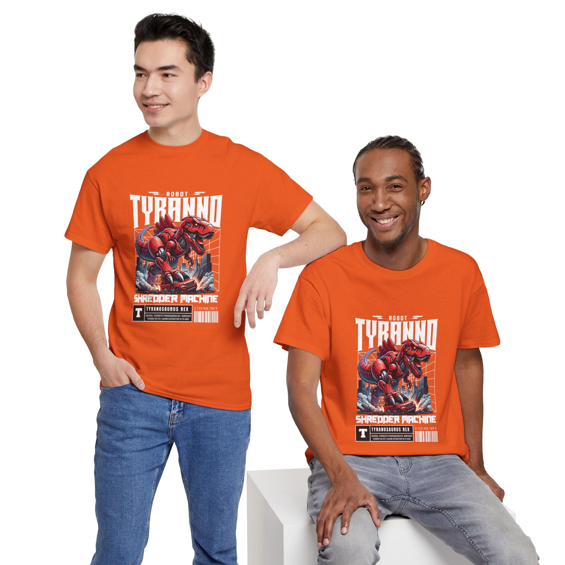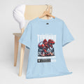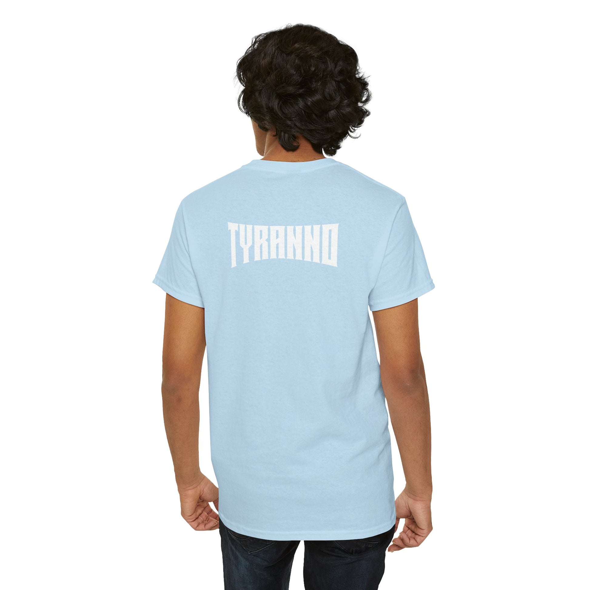 This heavyweight cotton tee brings loud, in-your-face energy to a casual wardrobe. A bold, illustrated centerpiece on the chest shows a chrome-clad Tyranno shredding through metal and sparks — retro arcade and metal-poster vibes collide. Clean, arched lettering on the upper back balances the front art so the shirt reads like a vintage concert or game-card collectible. The thicker 180 g/m² fabric and classic crew cut give it structure and a laid-back silhouette that wears well layered under a flannel or alone with distressed denim. Wear it to shows, game nights, or whenever you want apparel that feels like an anthem: gritty, graphic, and unapologetically loud.