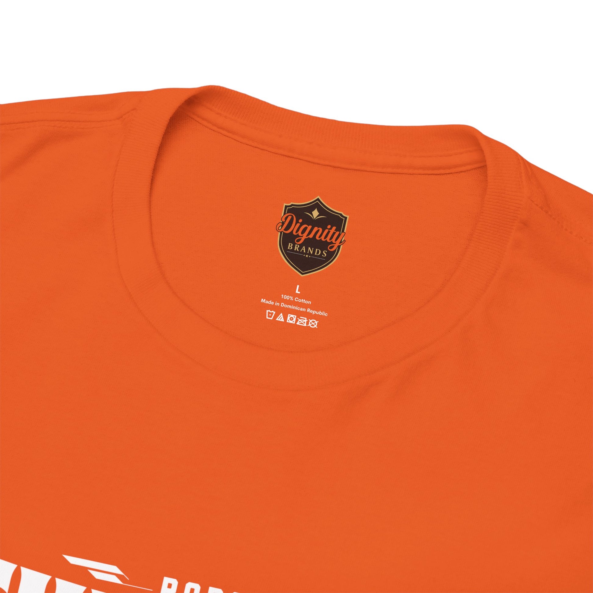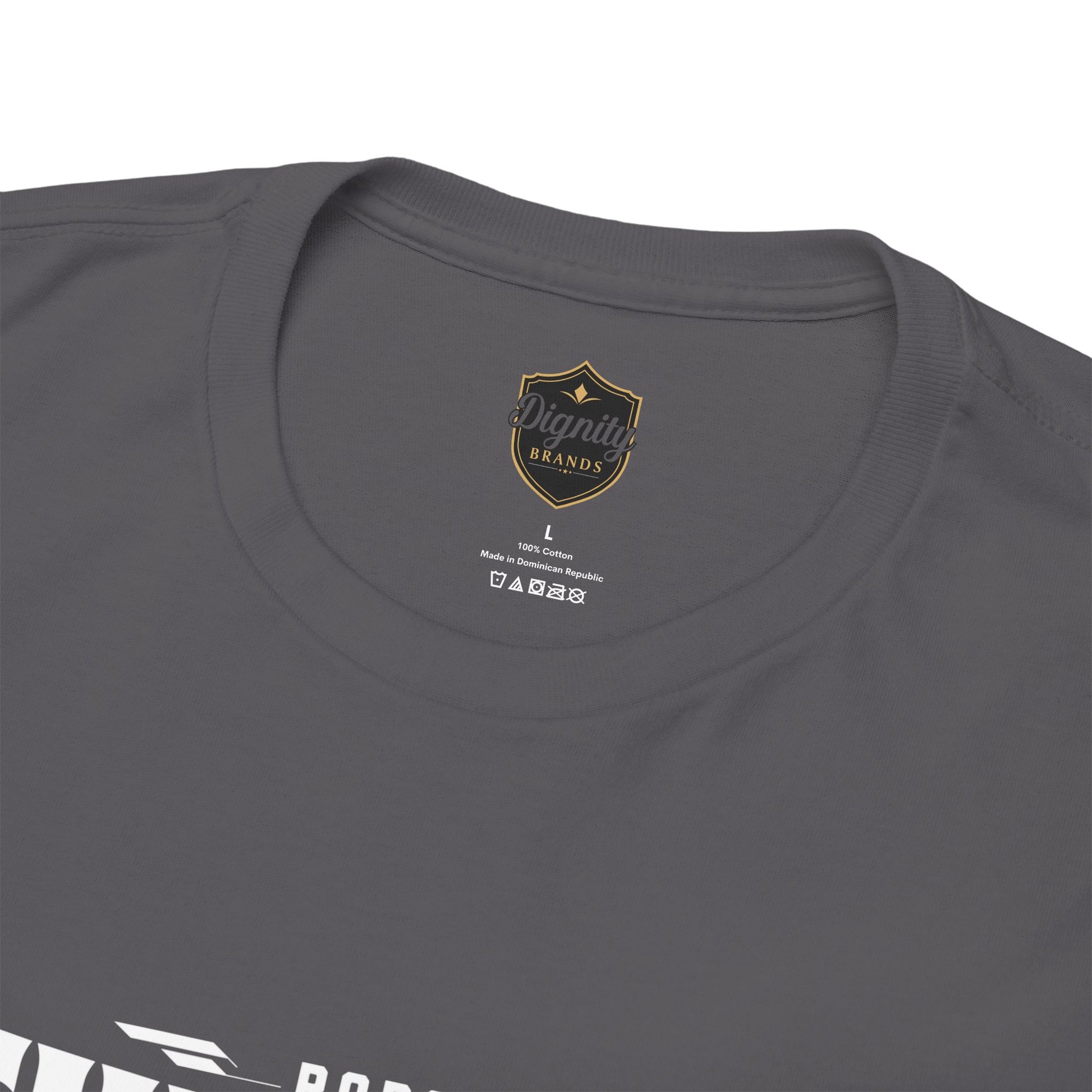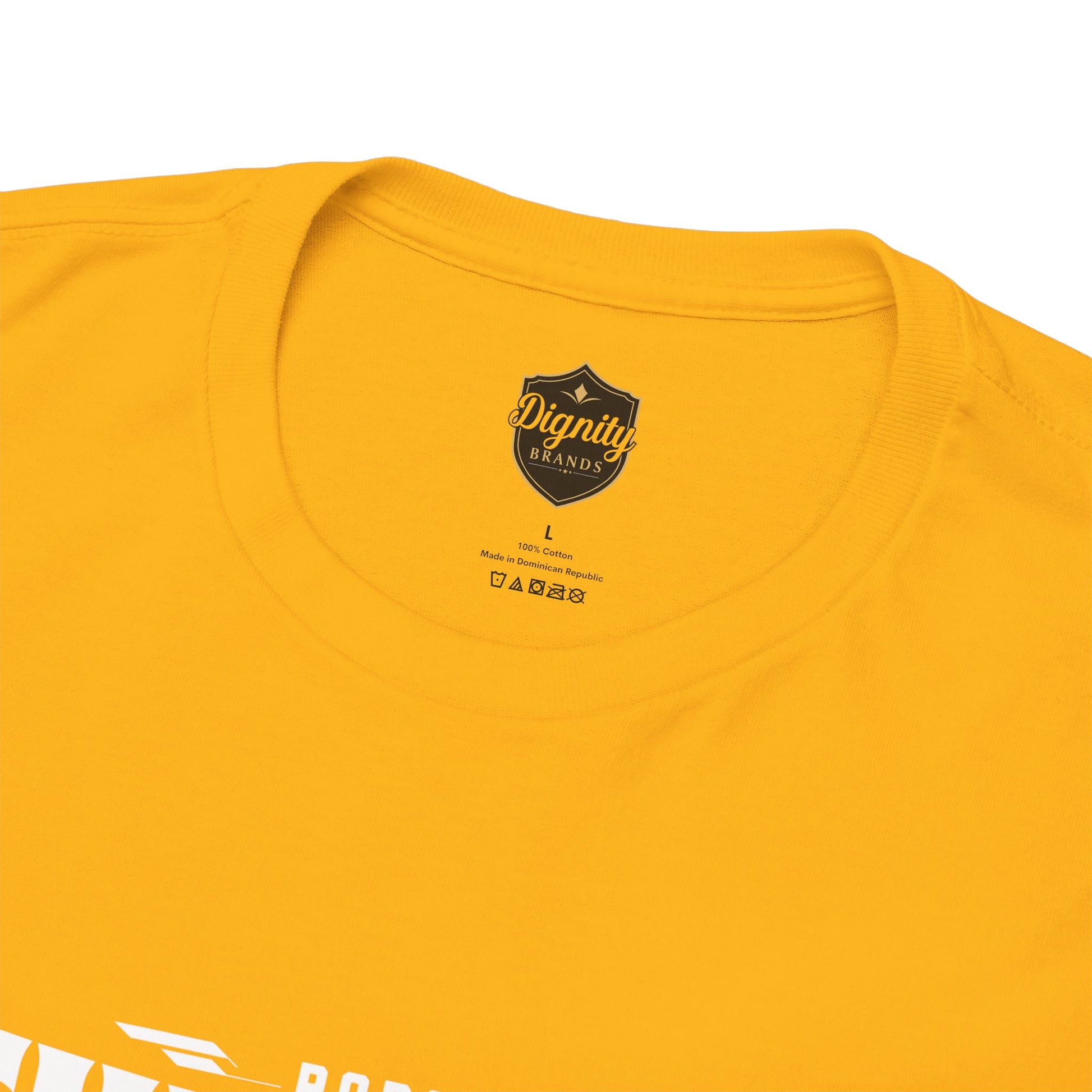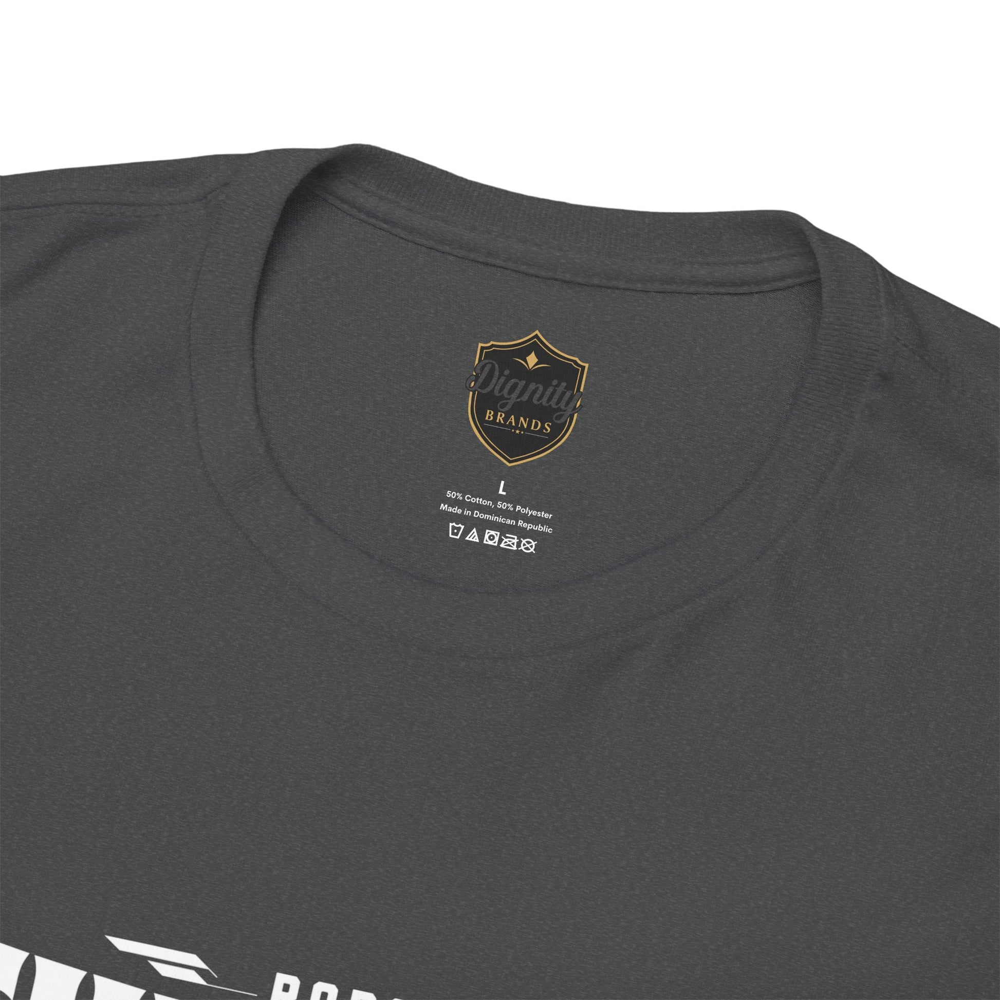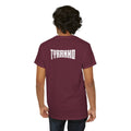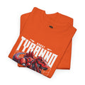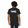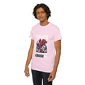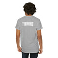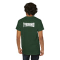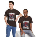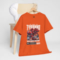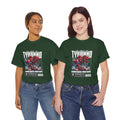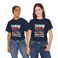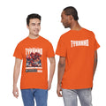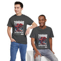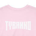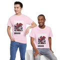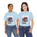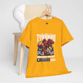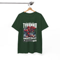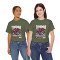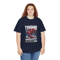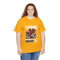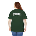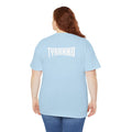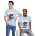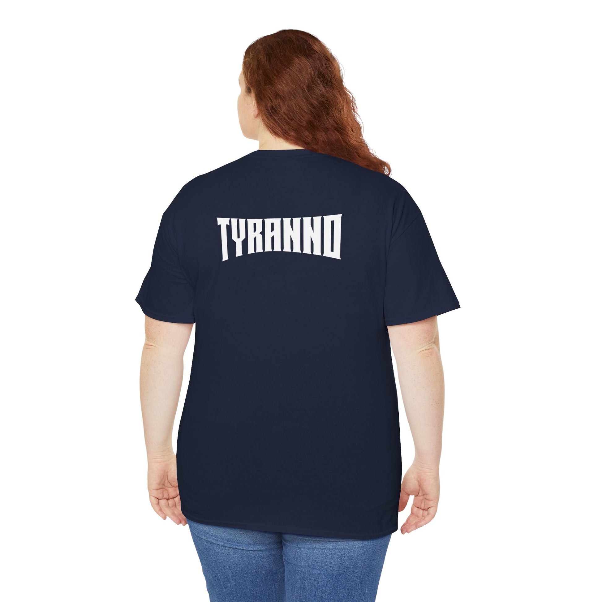 This heavyweight cotton tee brings loud, in-your-face energy to a casual wardrobe. A bold, illustrated centerpiece on the chest shows a chrome-clad Tyranno shredding through metal and sparks — retro arcade and metal-poster vibes collide. Clean, arched lettering on the upper back balances the front art so the shirt reads like a vintage concert or game-card collectible. The thicker 180 g/m² fabric and classic crew cut give it structure and a laid-back silhouette that wears well layered under a flannel or alone with distressed denim. Wear it to shows, game nights, or whenever you want apparel that feels like an anthem: gritty, graphic, and unapologetically loud.